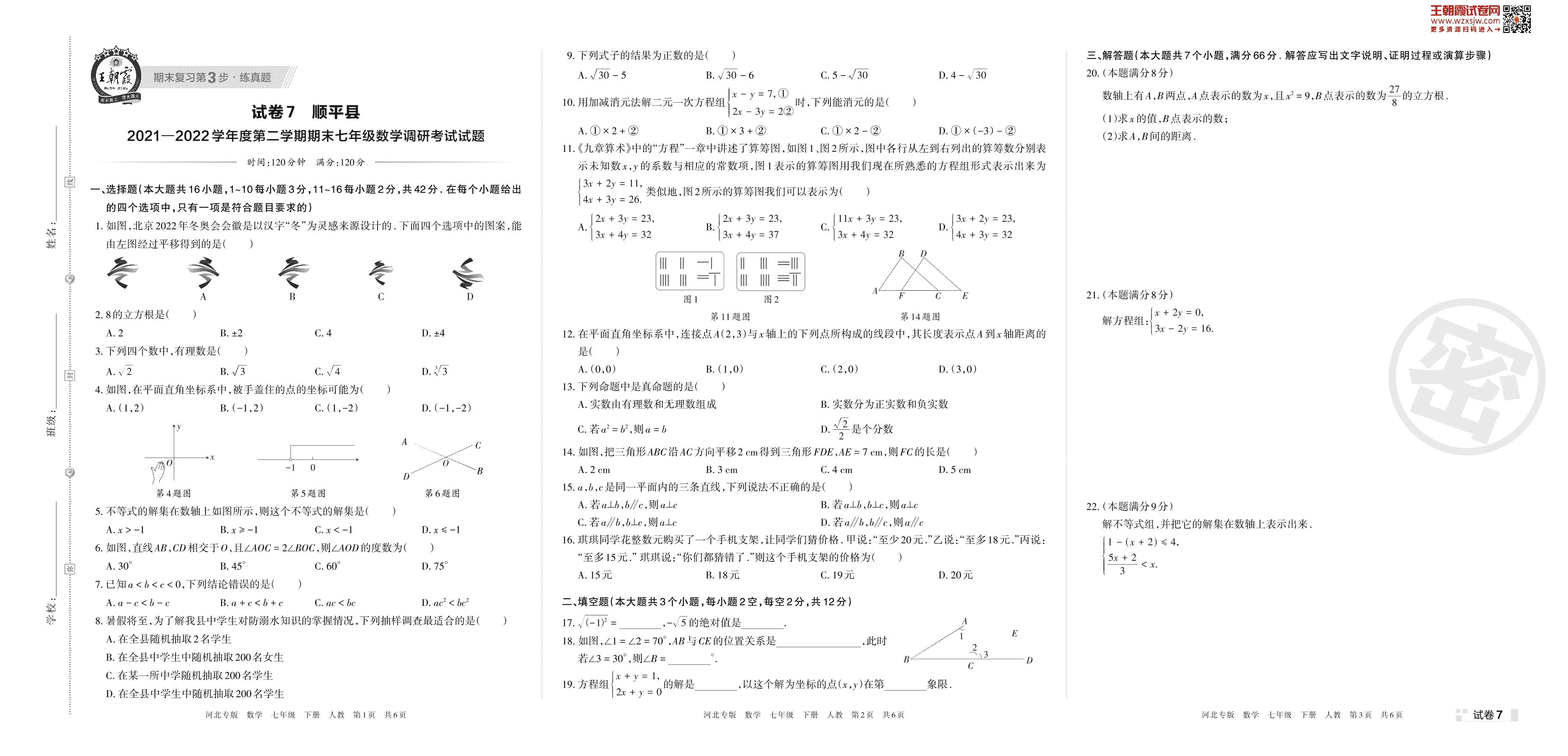 顺平县2021—2022学年度第二学期期末七年级数学调研考试试题(人教版)【7】