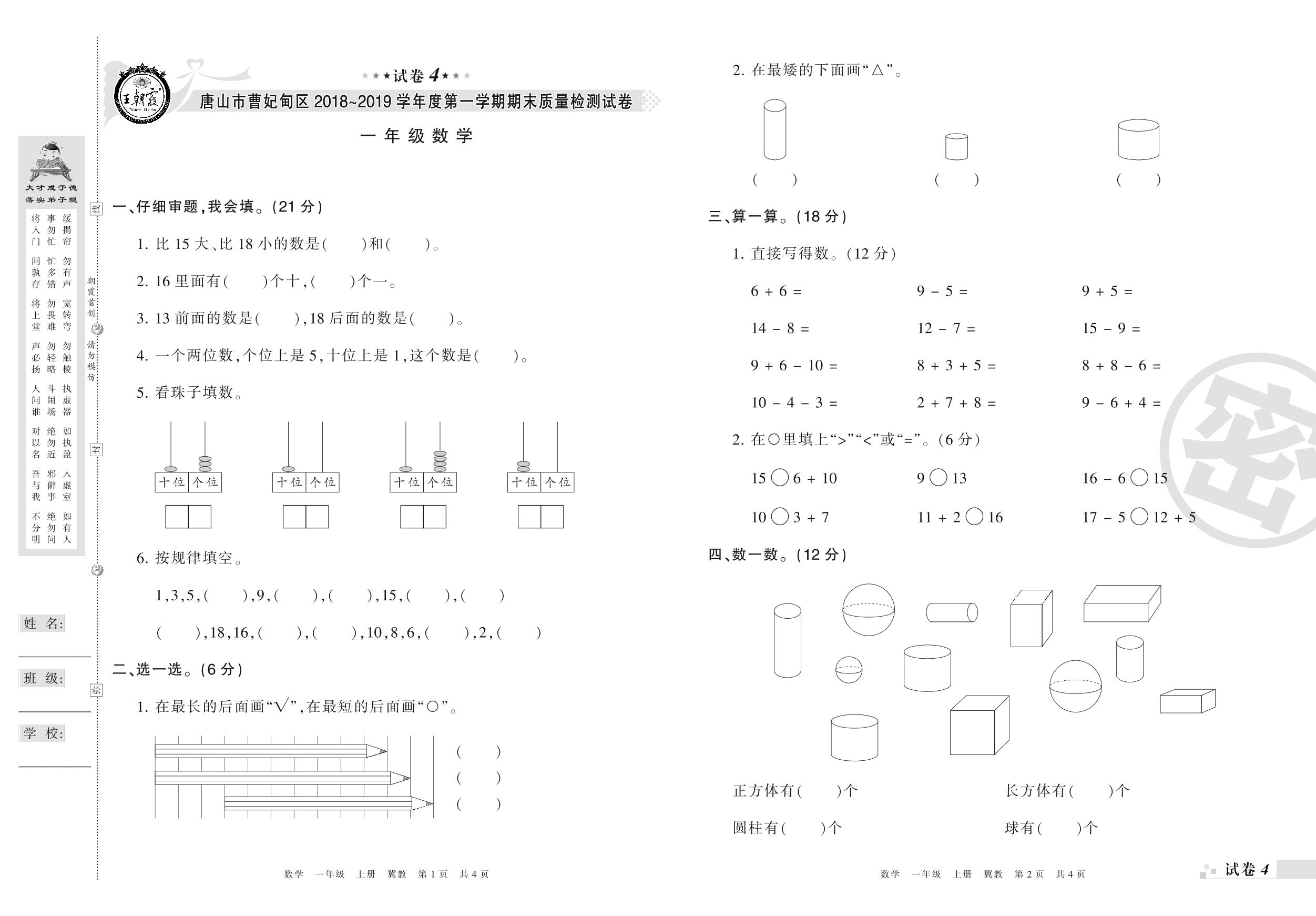 2018-2019学年第一学期唐山市曹妃甸区一年级数学试卷(冀教版)【4】