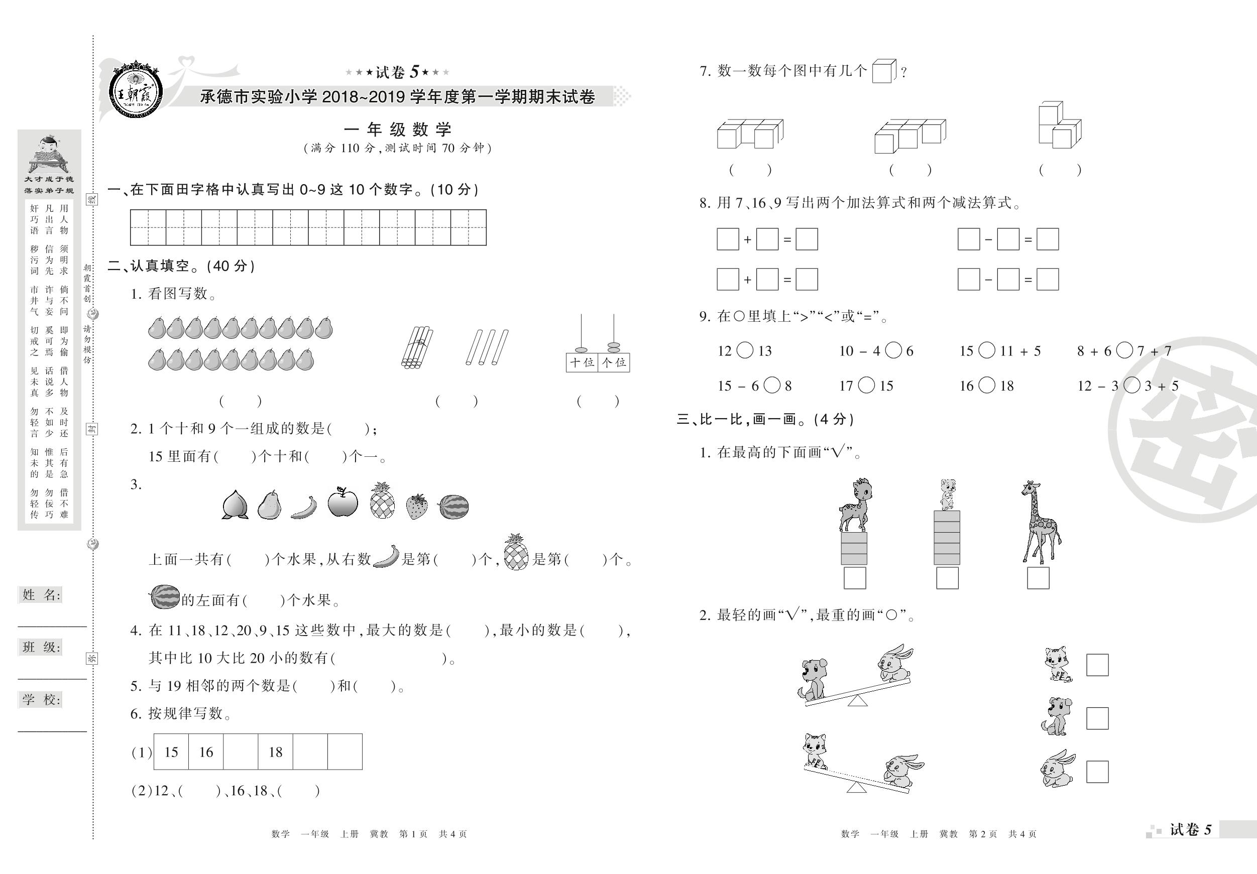 2018-2019学年第一学期承德市实验小学一年级数学试卷(冀教版)【5】