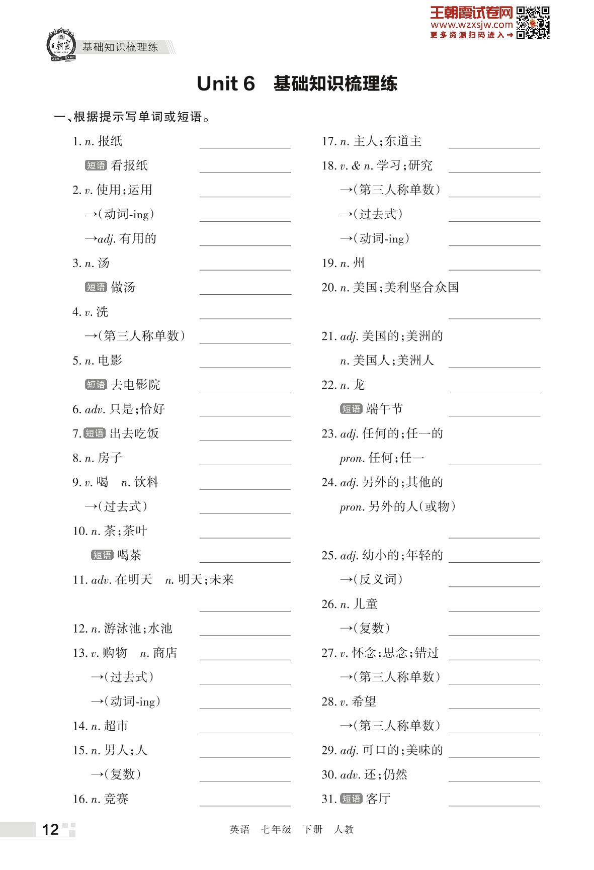 王朝霞期末过课本——Unit 6 基础知识梳理练七年级下册英语(人教版)_R230420155554246
