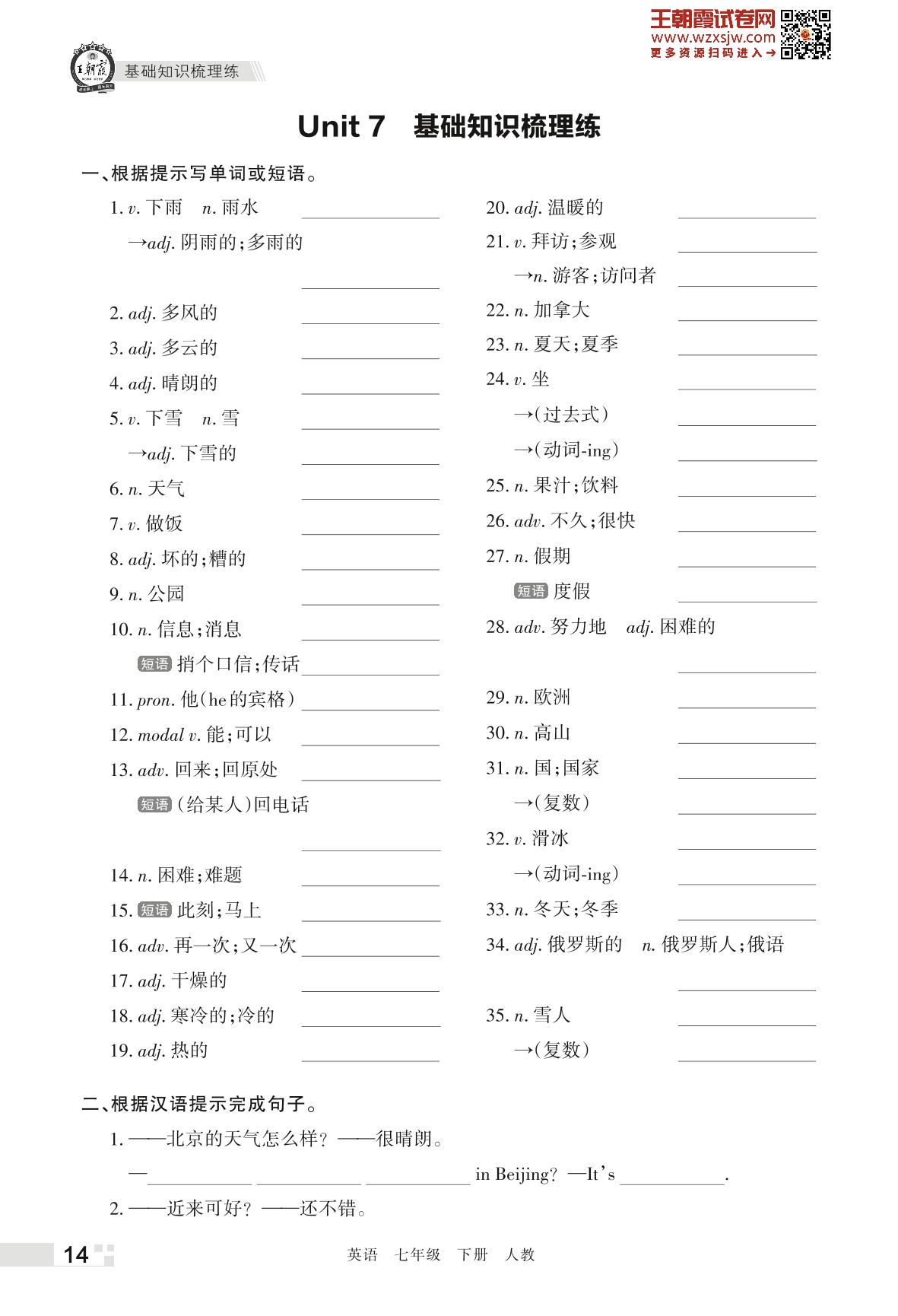 王朝霞期末过课本——Unit 7 基础知识梳理练七年级下册英语(人教版)_R230420155554294