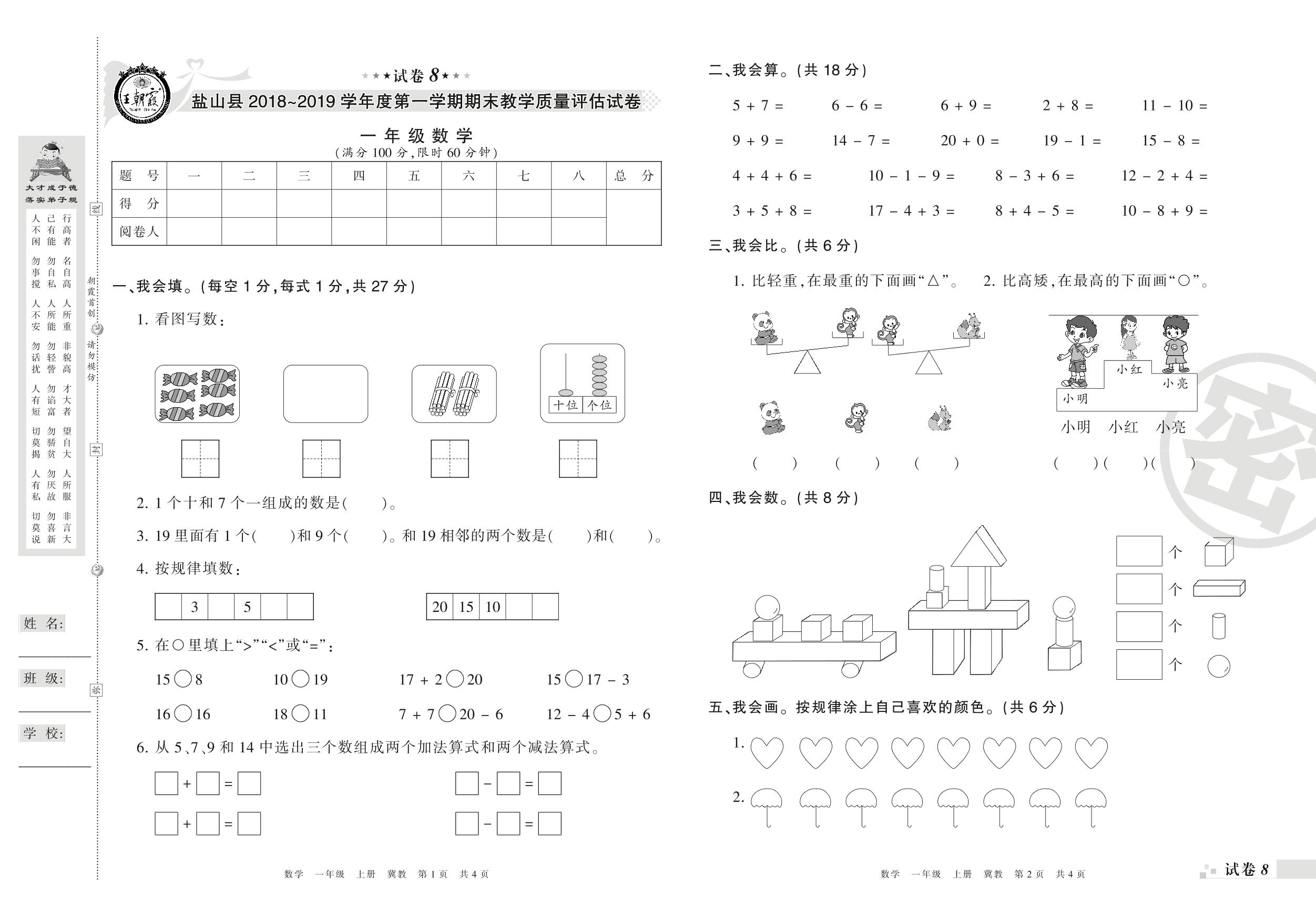 2018-2019学年第一学期沧州市盐山县一年级数学试卷(冀教版)【8】