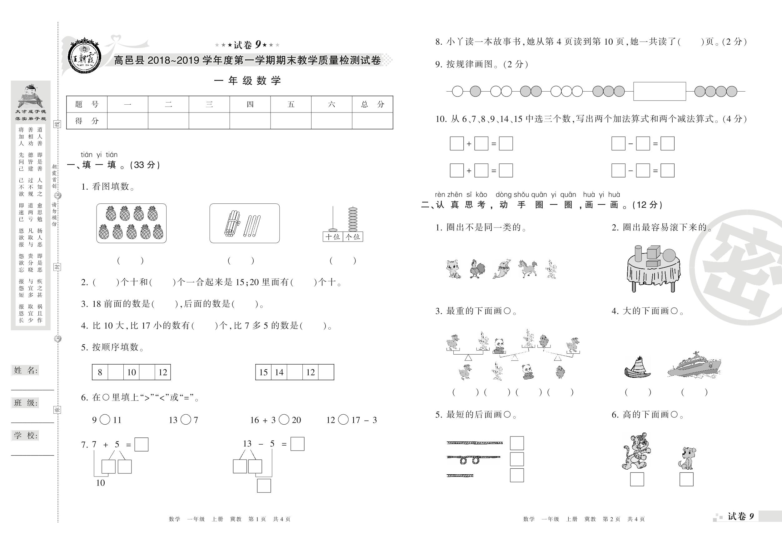 2018-2019学年第一学期石家庄市高邑县一年级数学试卷(冀教版)【9】