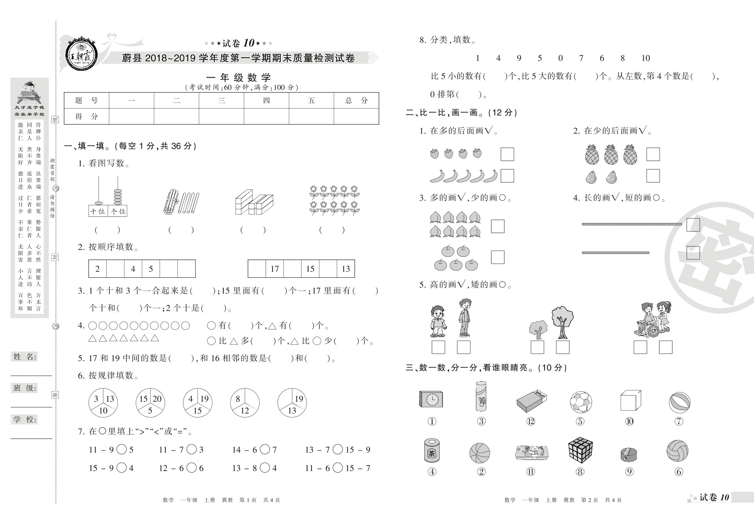 2018-2019学年第一学期张家口市蔚县一年级数学试卷(冀教版)【10】