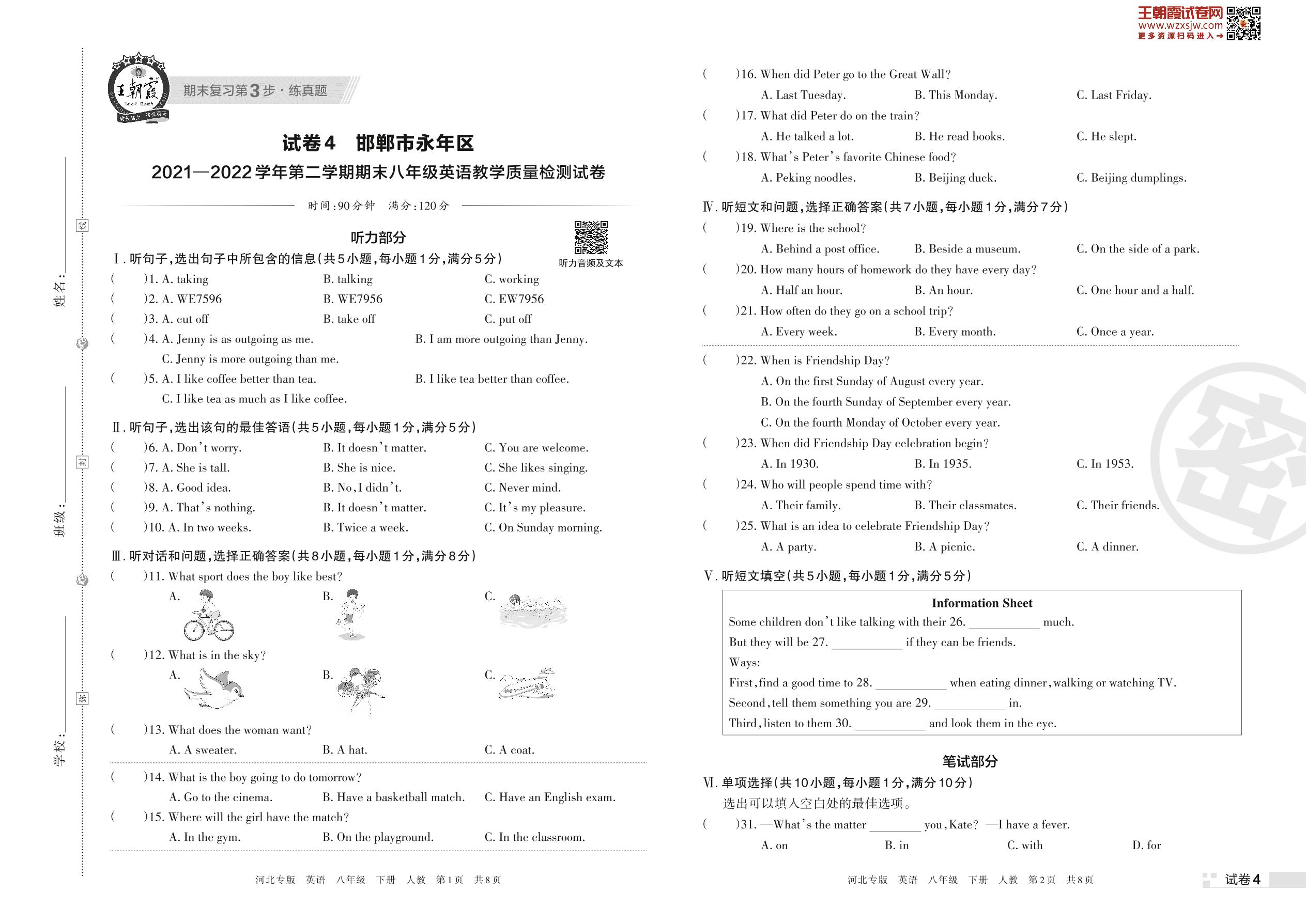 邯郸市永年区2021—2022学年第二学期期末八年级英语教学质量检测试卷(人教版)【4】