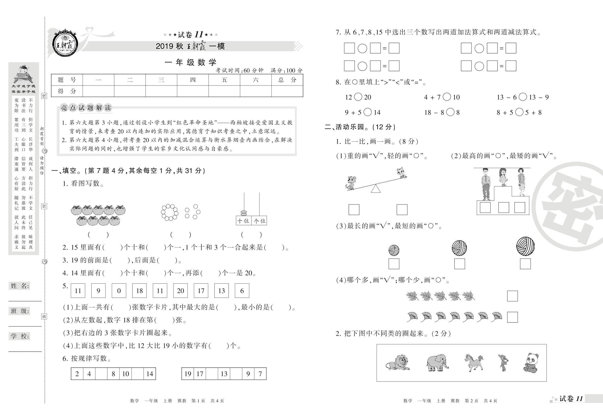 王朝霞期末模拟卷一年级上册数学(冀教版)_R210802214800【11】