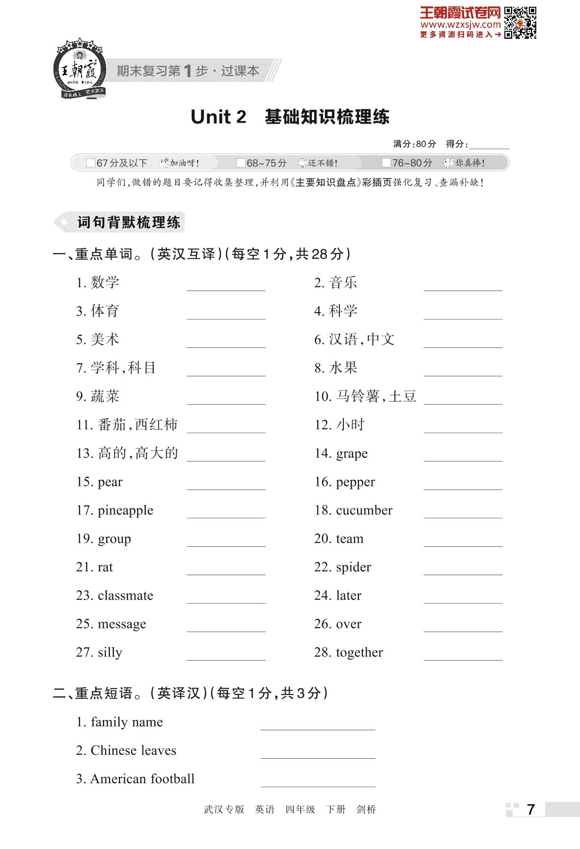 王朝霞期末过课本——Unit 2 基础知识梳理练四年级下册英语(剑桥版)_R230420160830762