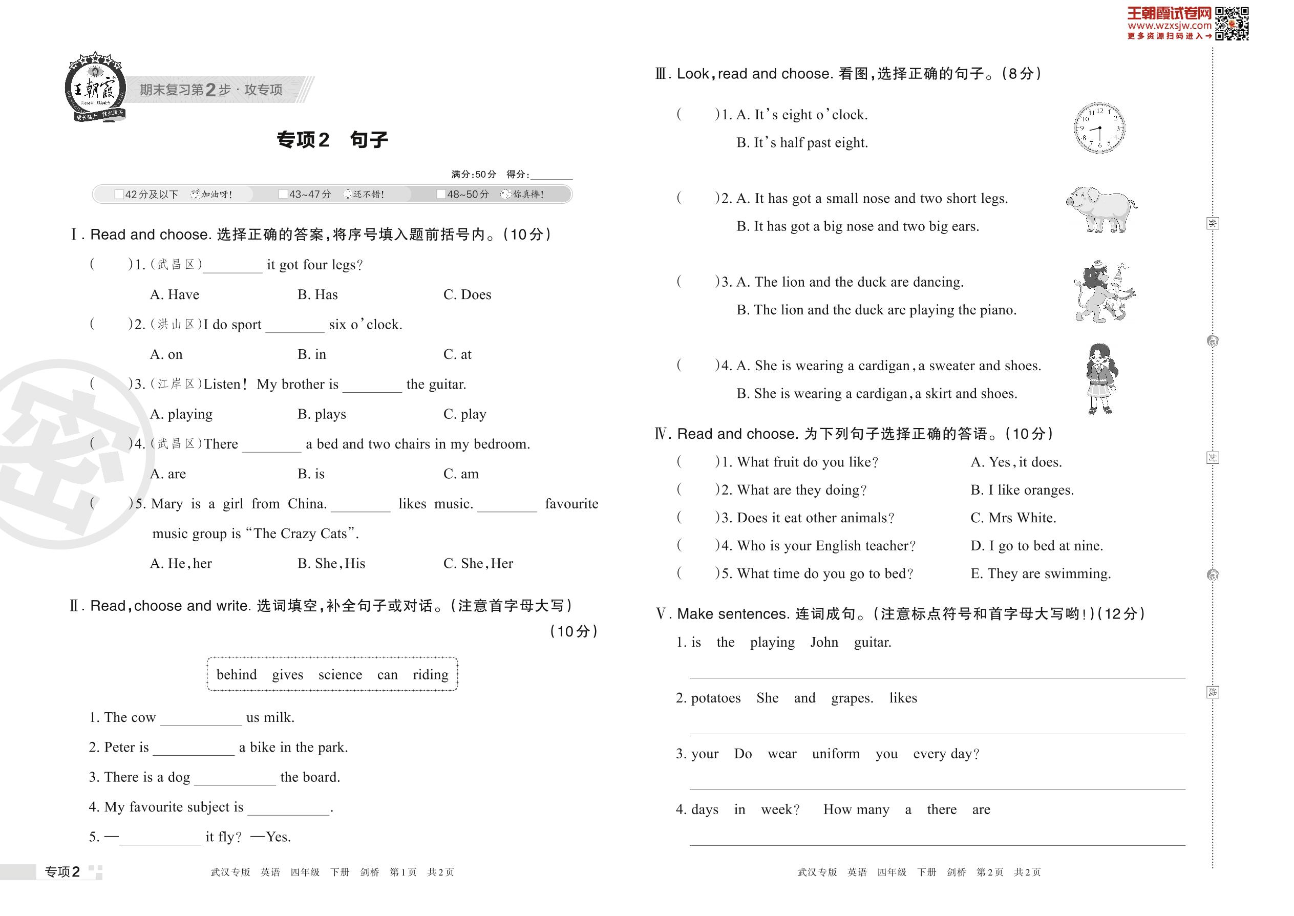 王朝霞期末专项卷——句子四年级下册英语(剑桥版)_R230420160830011【2】