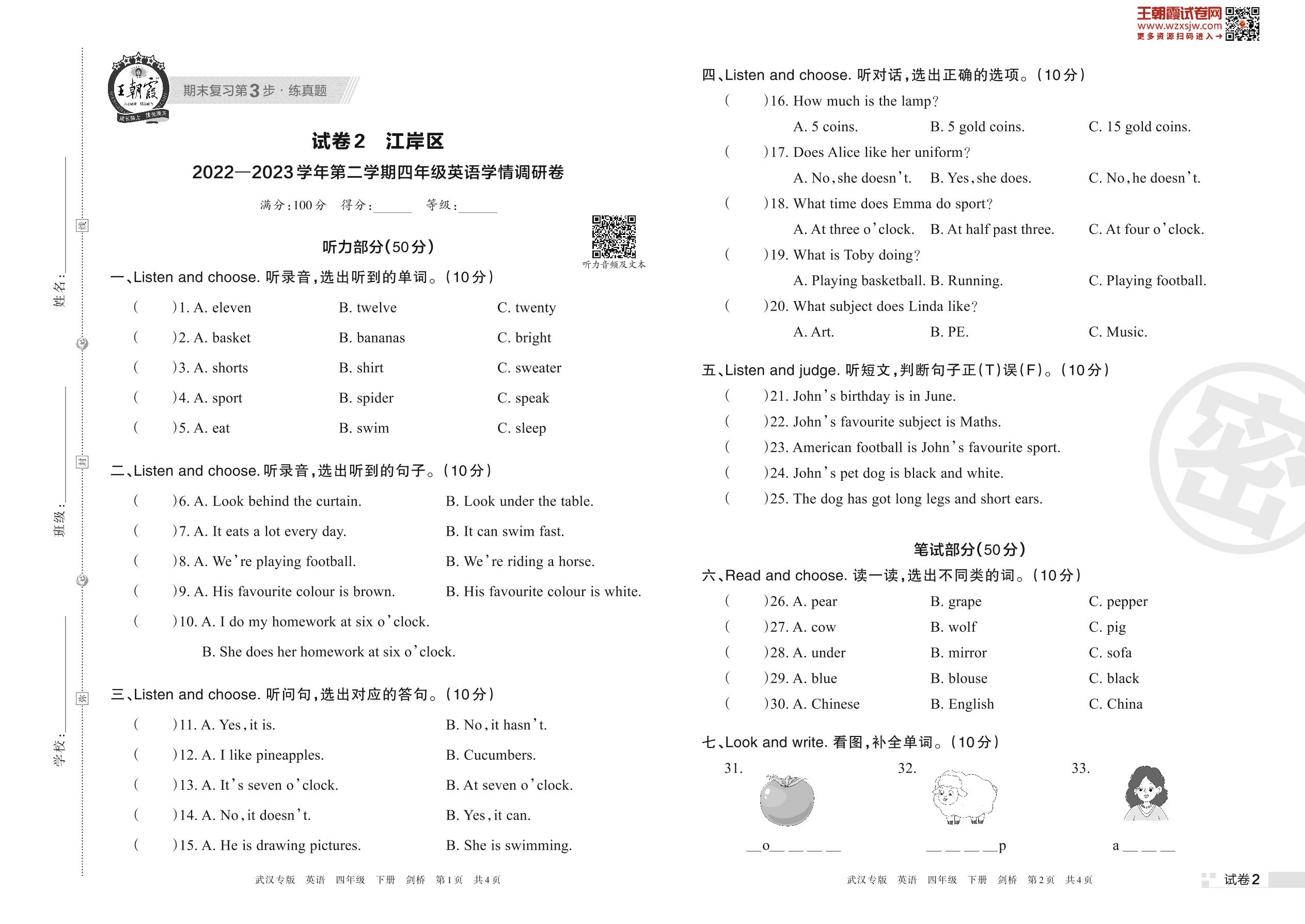 江岸区2022—2023学年第二学期四年级英语学情调研卷(剑桥版)【2】