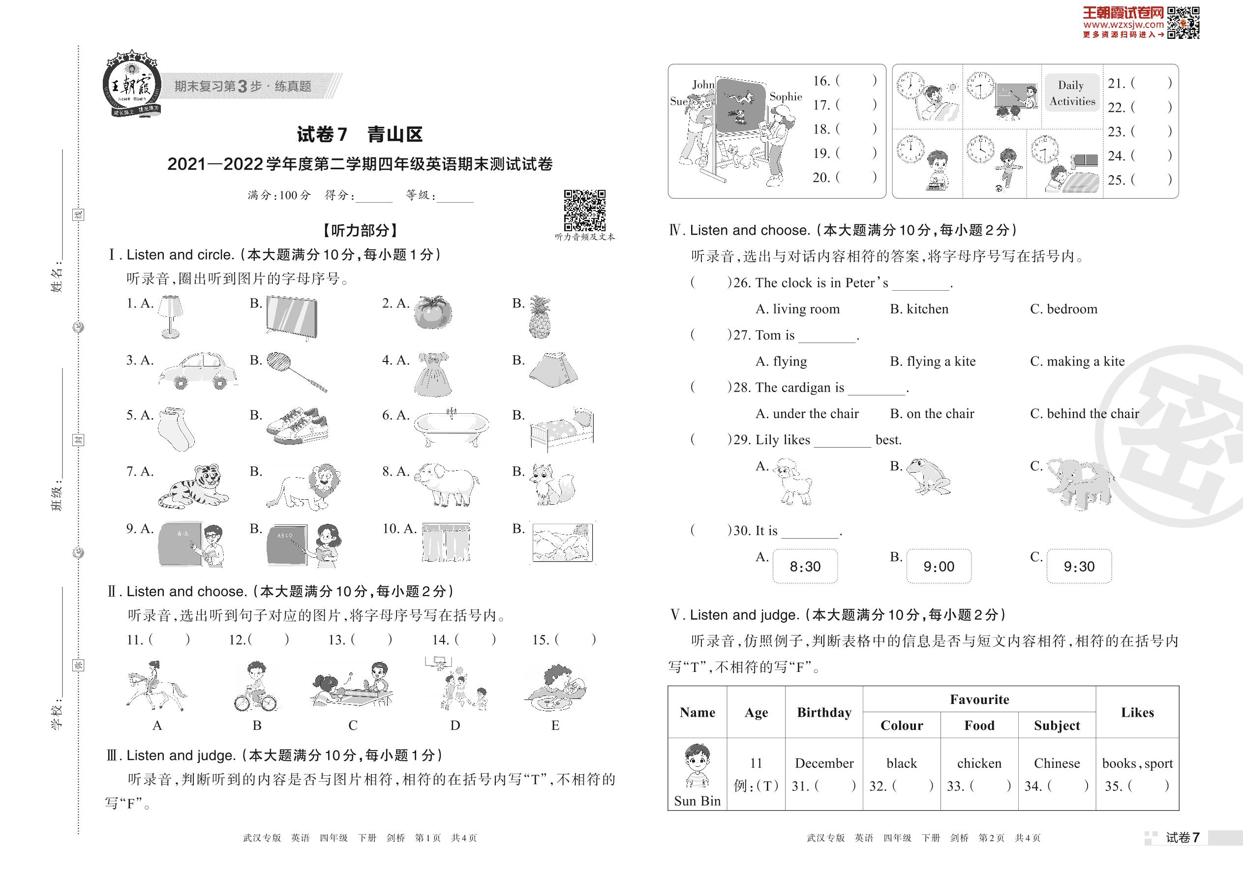青山区2021—2022学年度第二学期四年级英语期末测试试卷(剑桥版)【7】