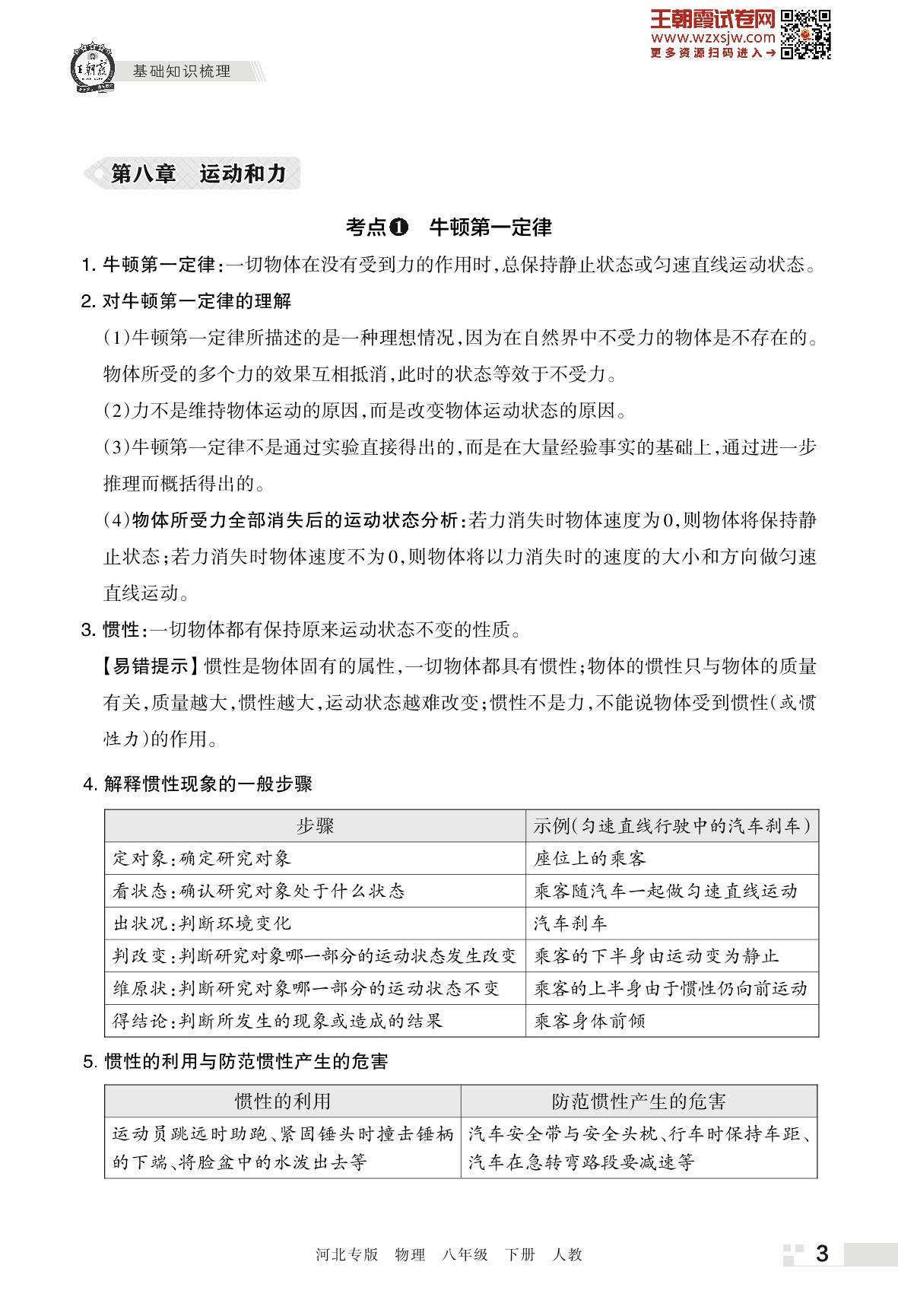 王朝霞期末知识梳理——第八章 运动和力八年级下册物理(人教版)