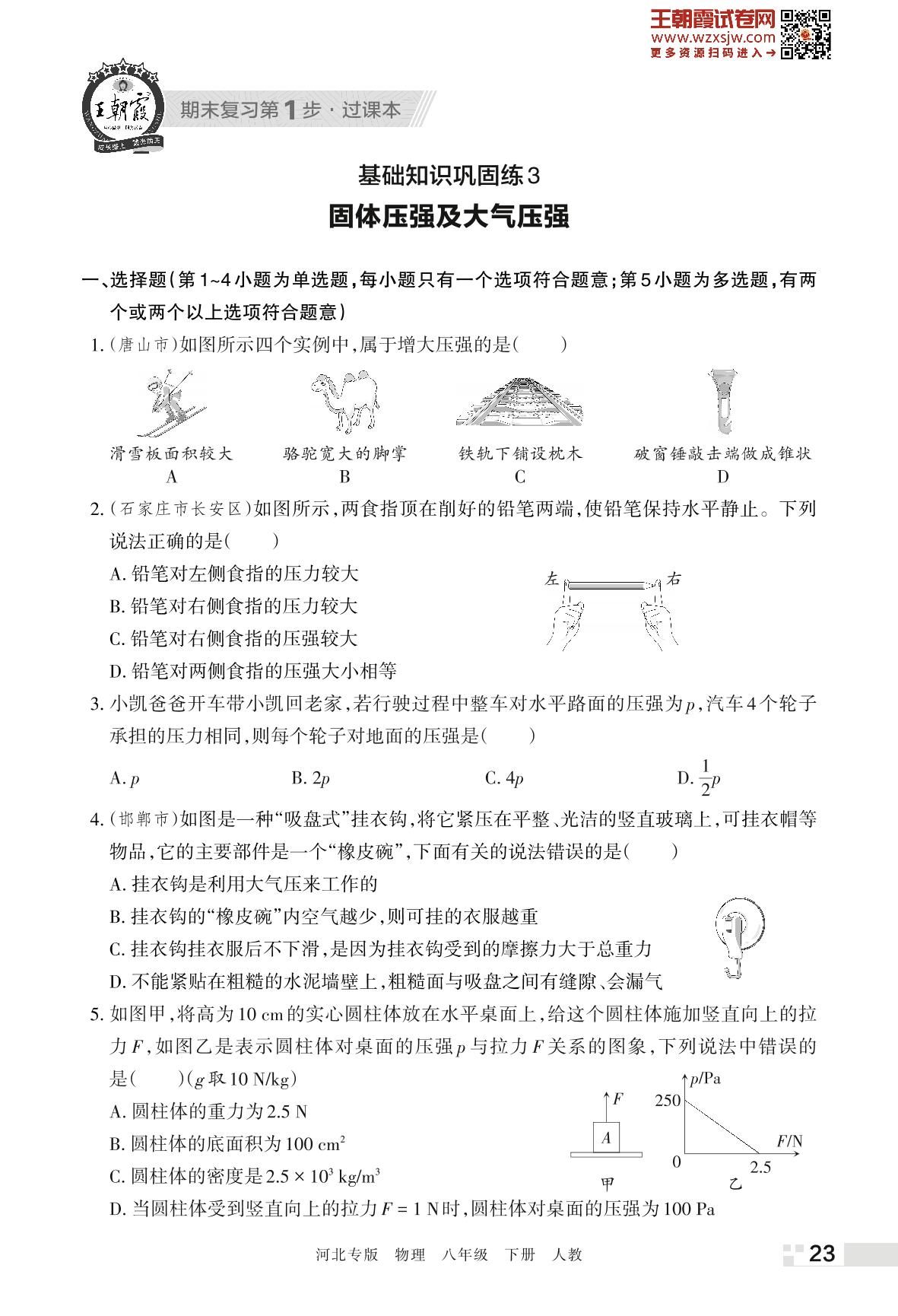 王朝霞期末过课本——基础知识巩固练3 固体压强及大气压强八年级下册物理(人教版)_R230420161024635