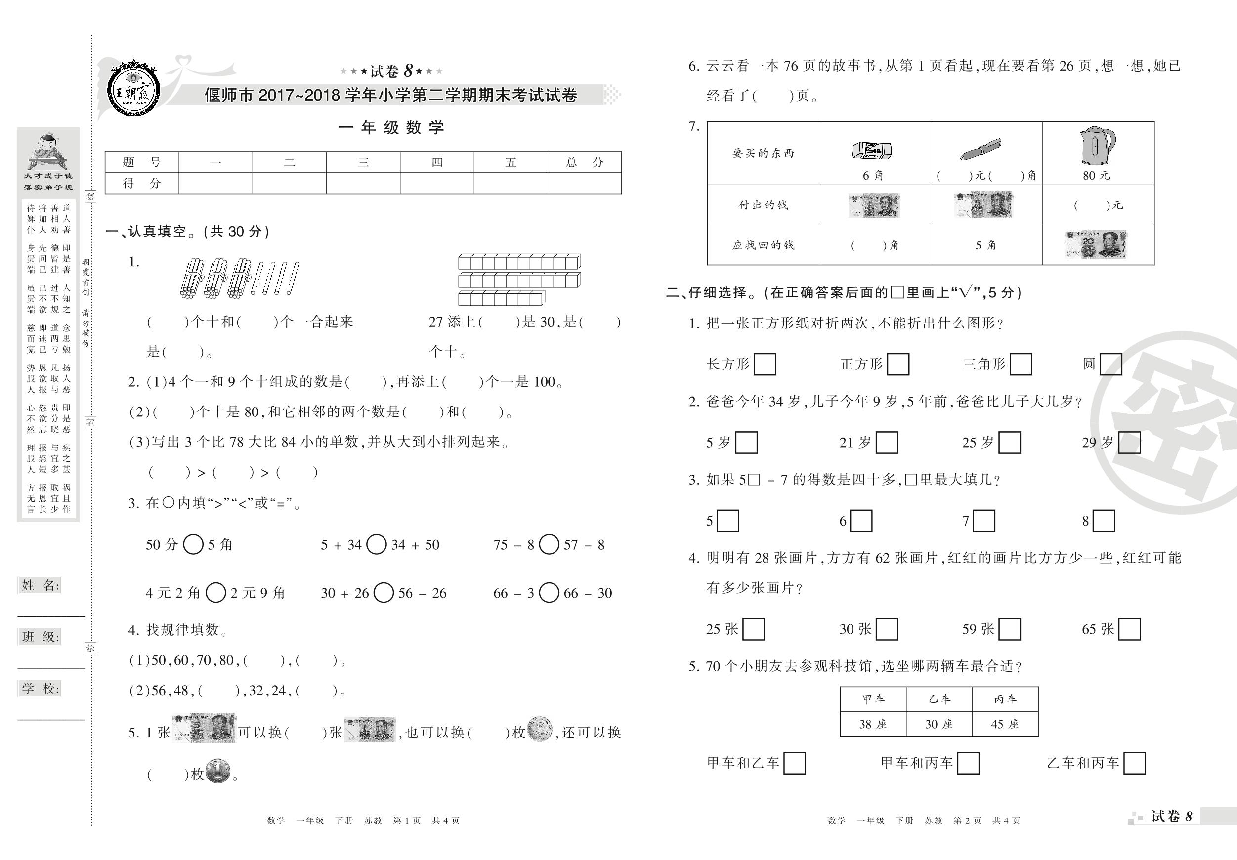 2017-2018学年第二学期偃师市一年级数学试卷(苏教版)【8】