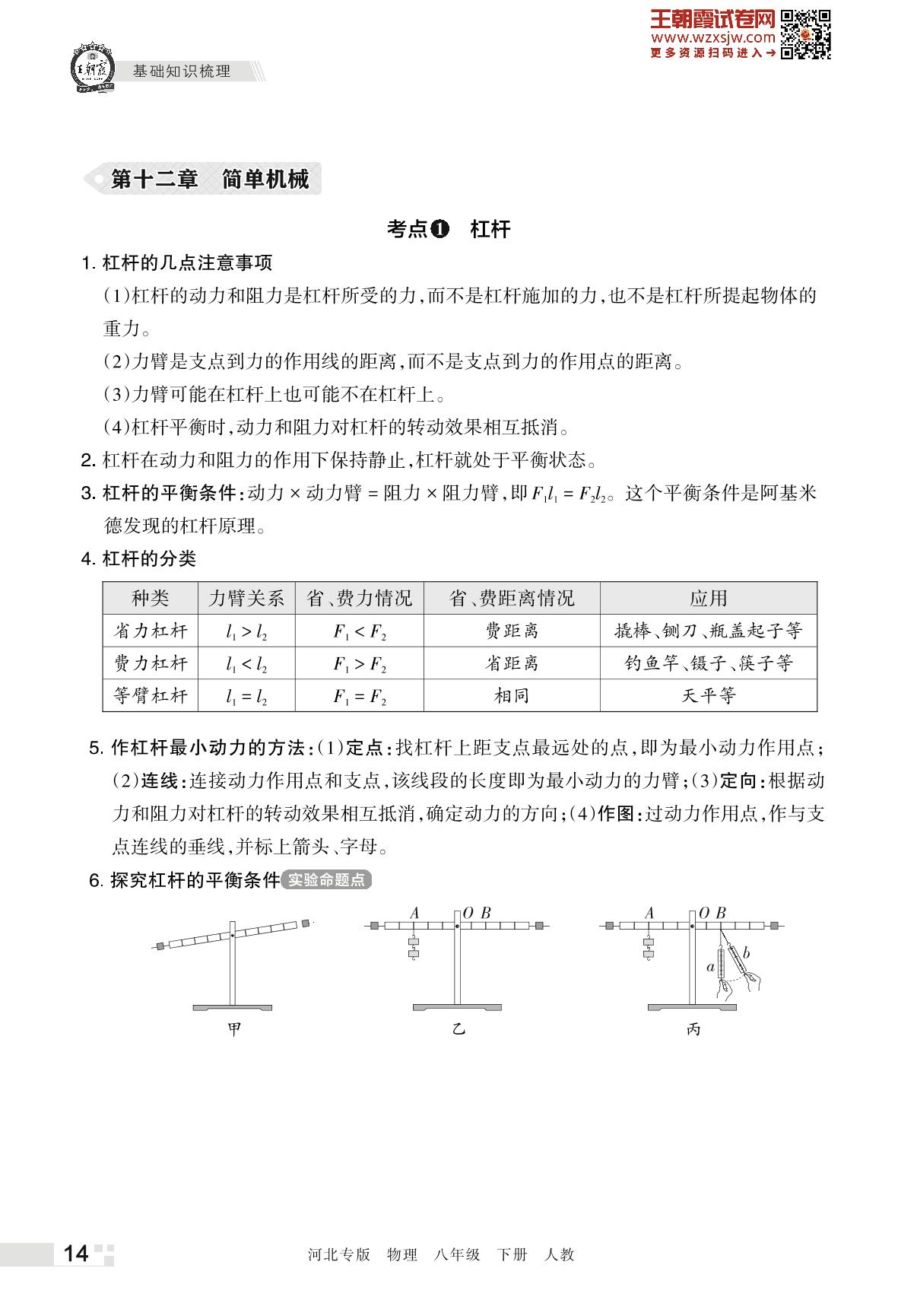 王朝霞期末知识梳理——第十二章 简单机械八年级下册物理(人教版)