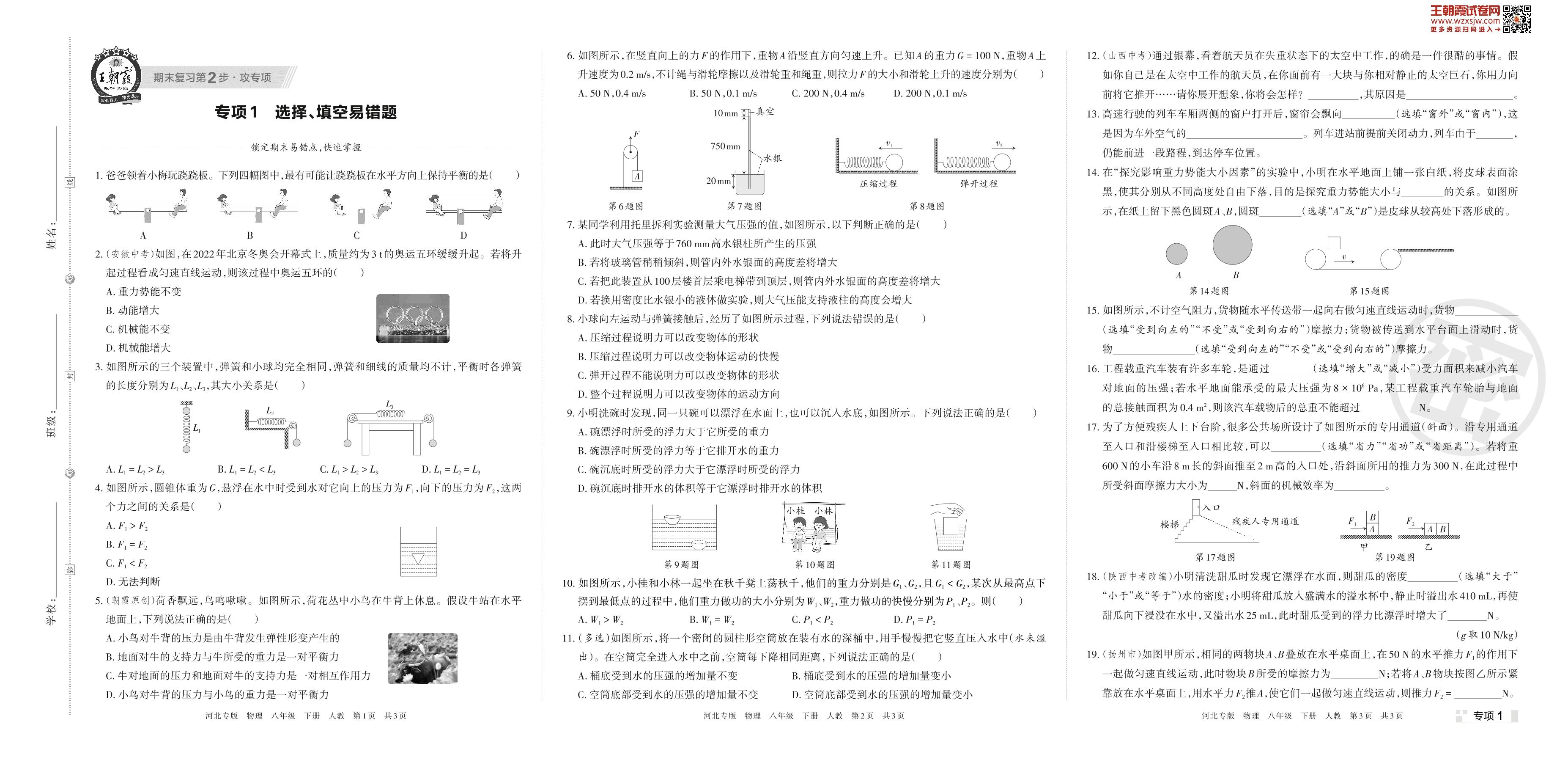 王朝霞期末专项卷——选择、填空易错题八年级下册物理(人教版)【1】