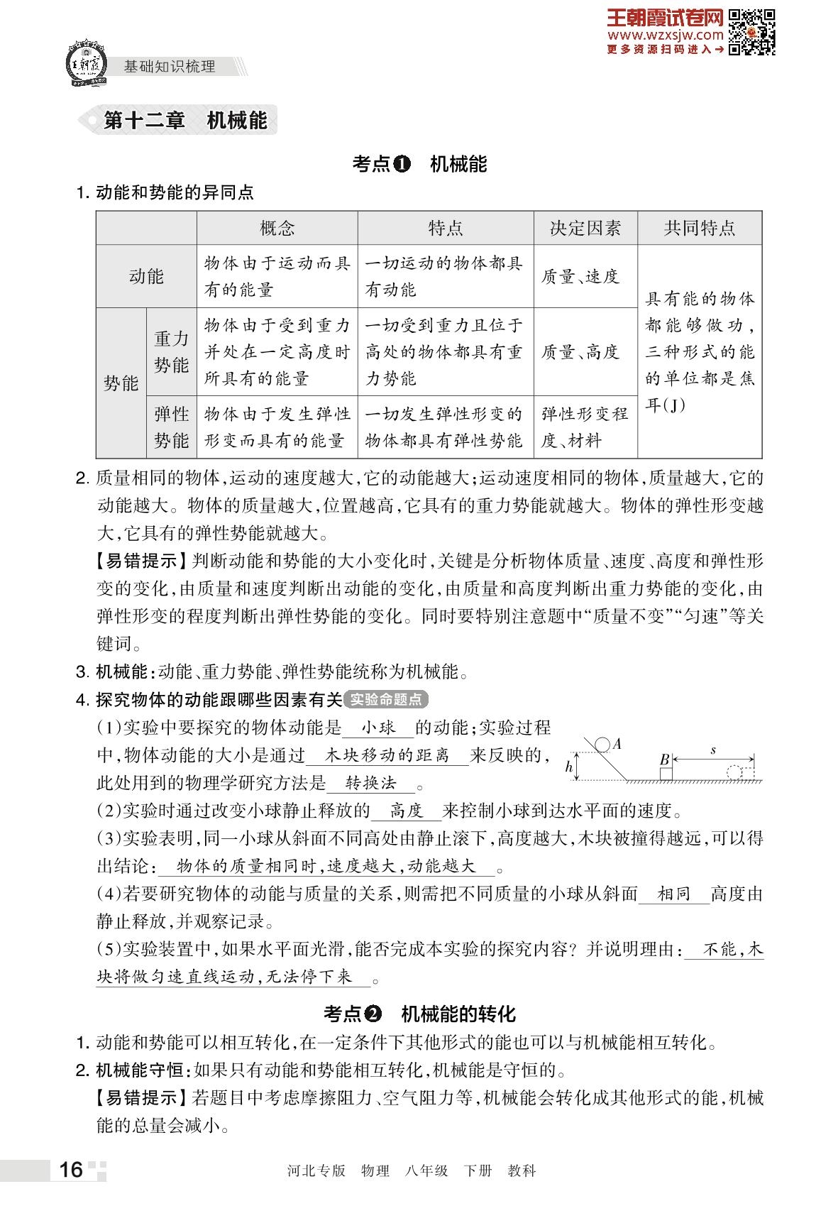 王朝霞期末知识梳理——第十二章 机械能八年级下册物理(教科版)