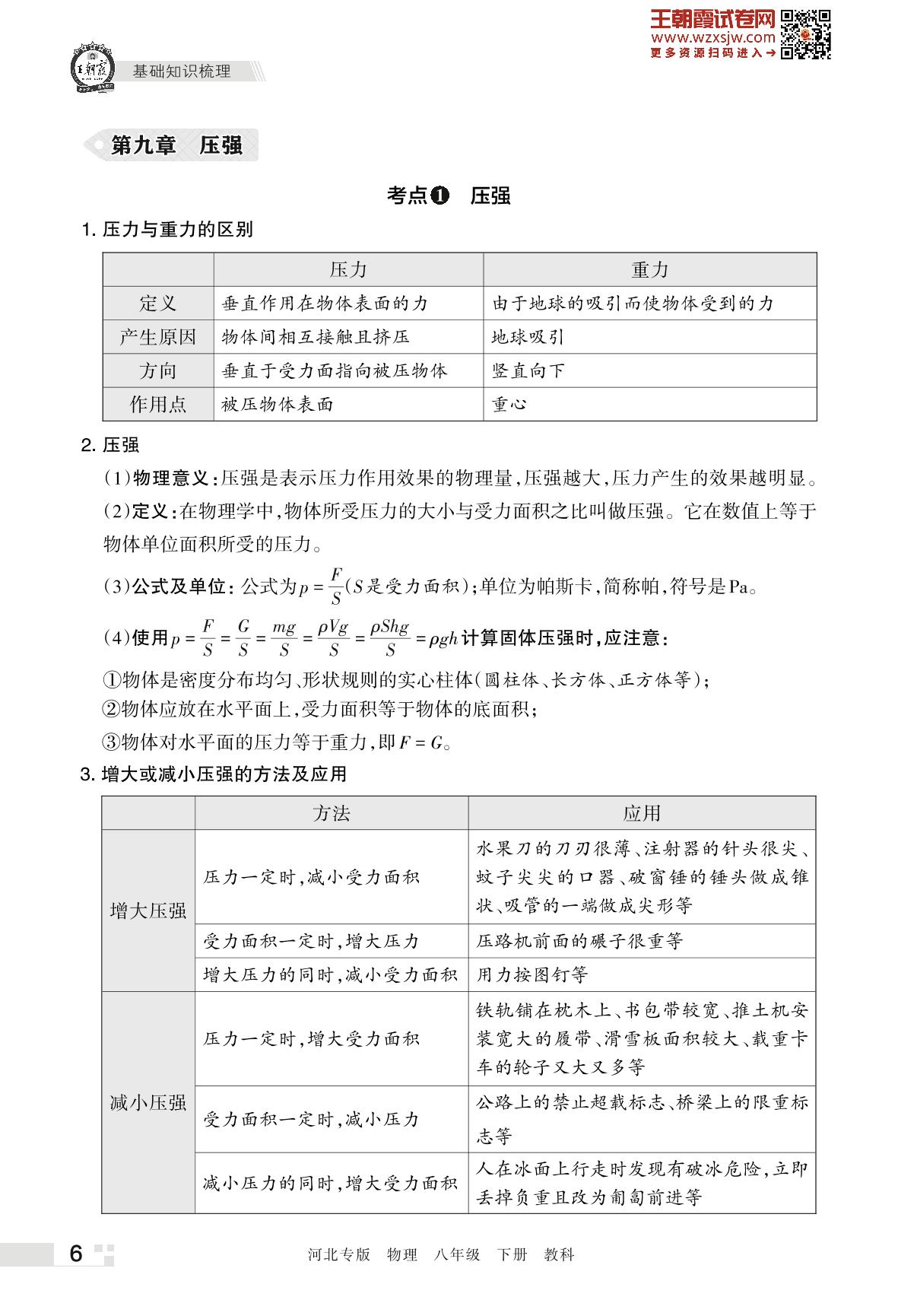 王朝霞期末知识梳理——第九章 压强八年级下册物理(教科版)