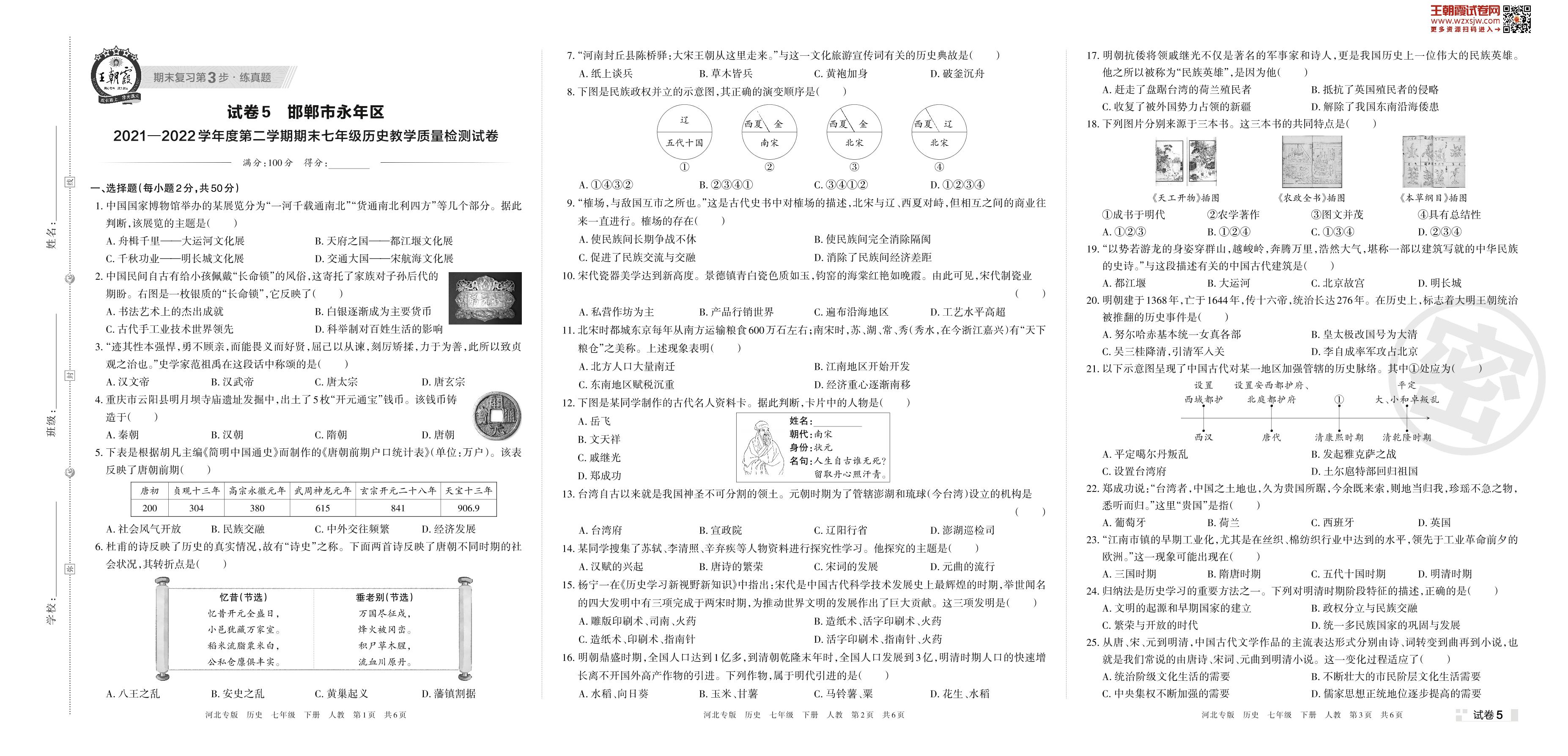邯郸市永年区2021—2022学年度第二学期期末七年级历史教学质量检测试卷(人教版)【5】