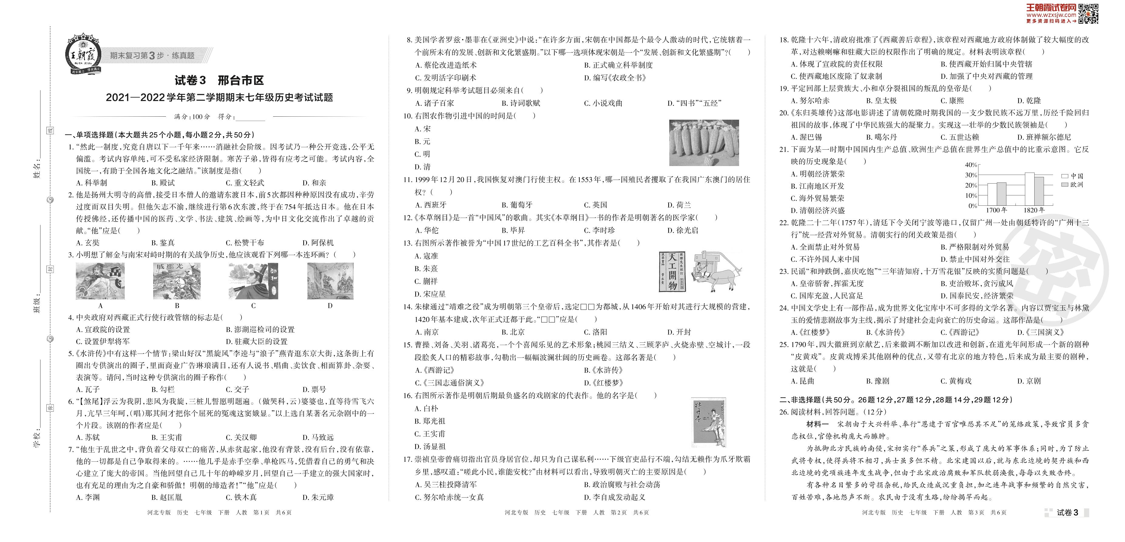 七年级历史人教版下册期末卷