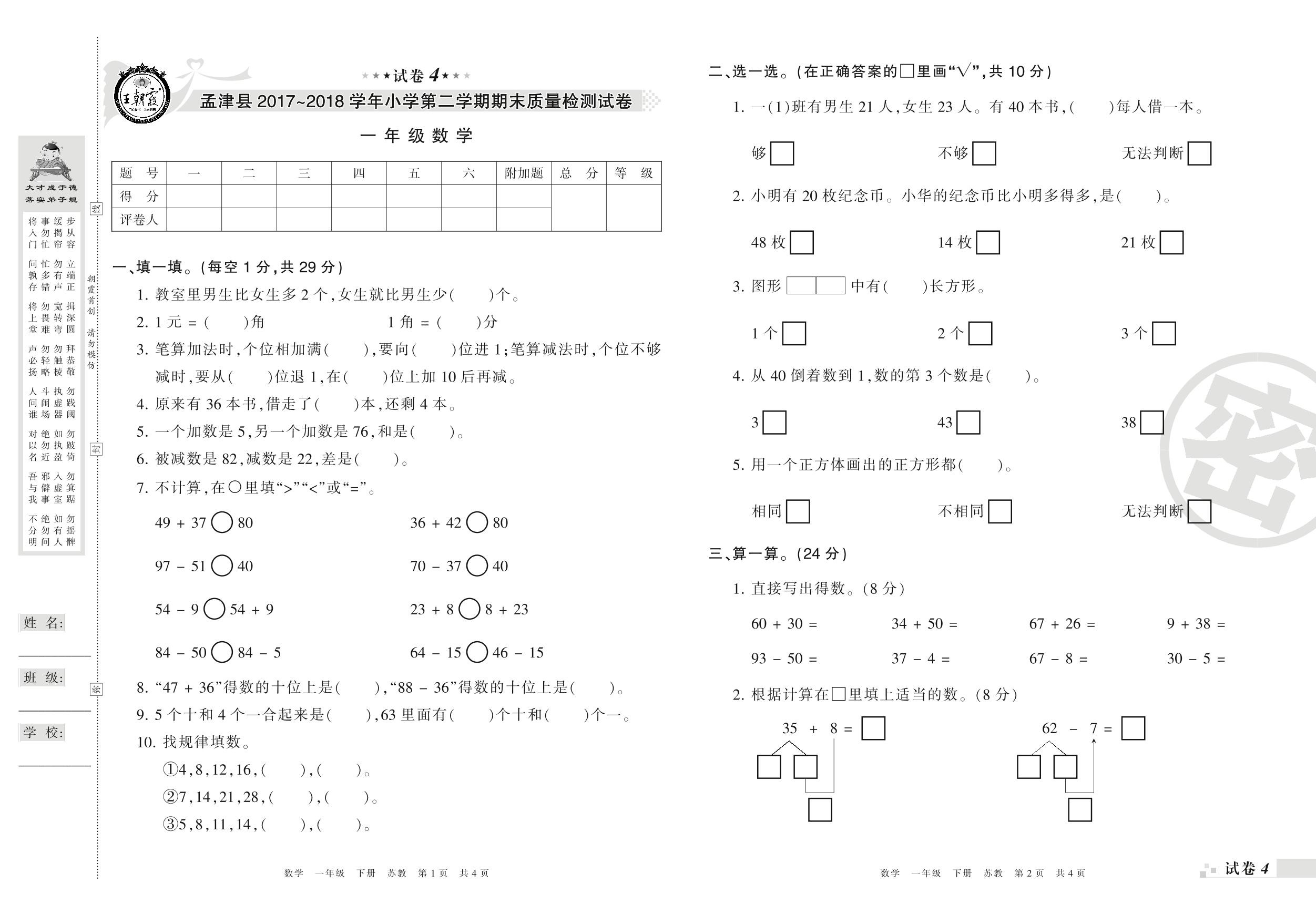 一年级数学苏教版下册期末卷