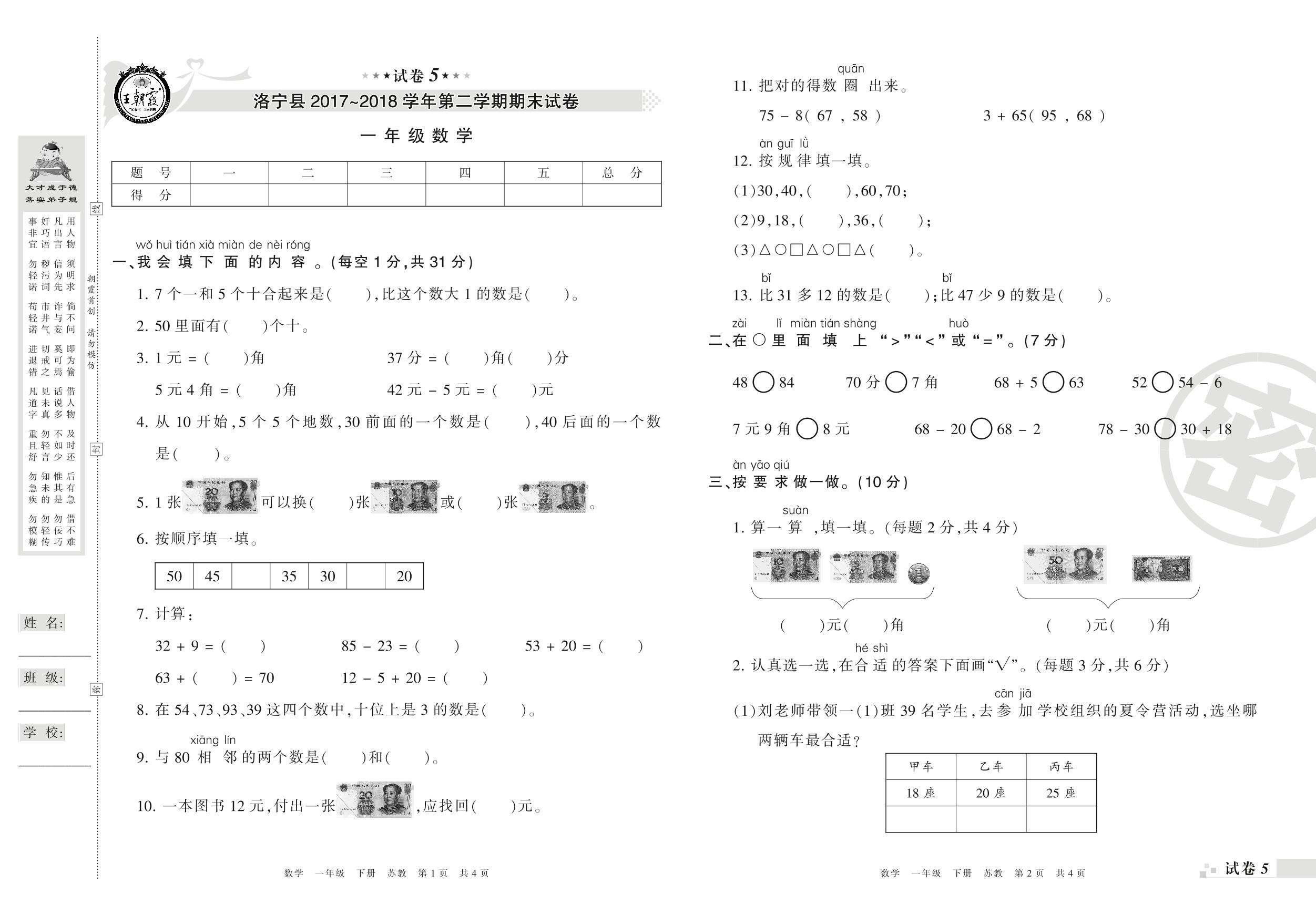 2017-2018学年第二学期洛阳市洛宁县一年级数学试卷(苏教版)【5】