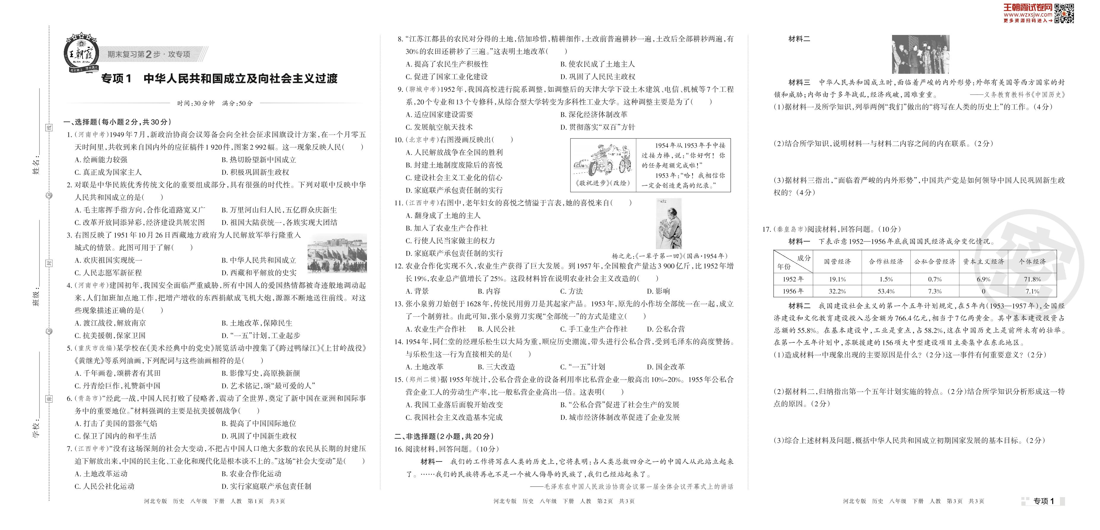 王朝霞期末专项卷——中华人民共和国成立及向社会主义过渡八年级下册历史(人教版)【1】