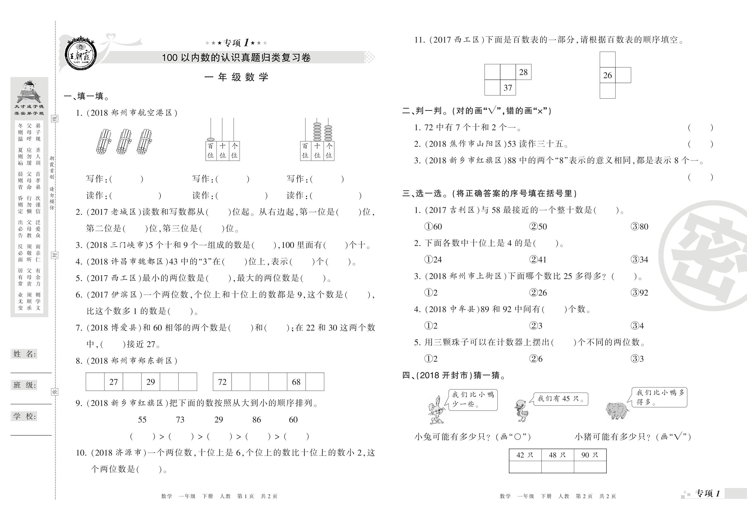 王朝霞期末专项卷——100以内数的认识、100以内加减法的计算(一)真题归类复习卷一年级下册数学(人教版)_R210802214913【0】