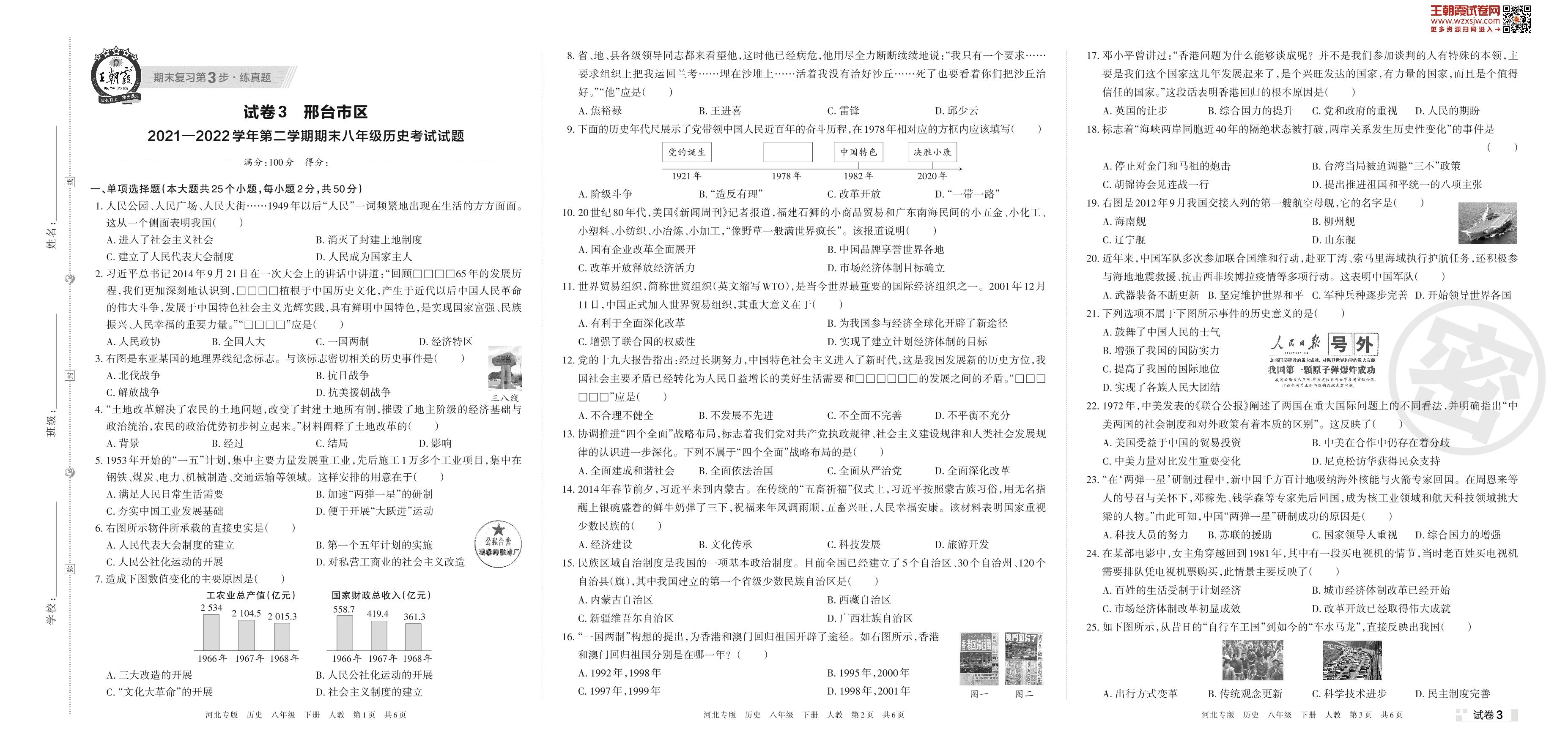 邢台市区2021—2022学年第二学期期末八年级历史考试试题(人教版)【3】