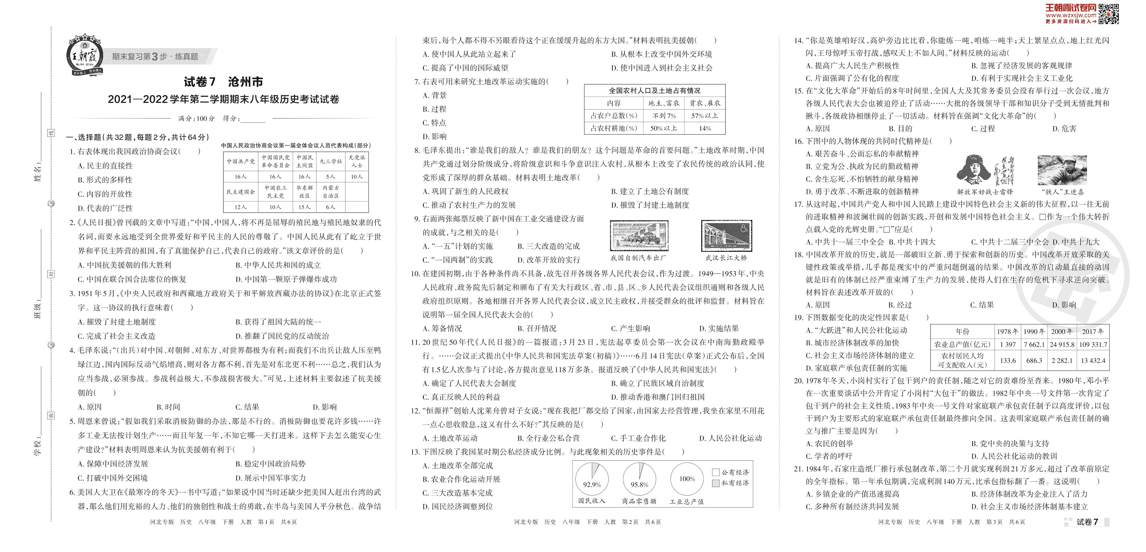 沧州市2021—2022学年第二学期期末八年级历史考试试卷(人教版)【7】
