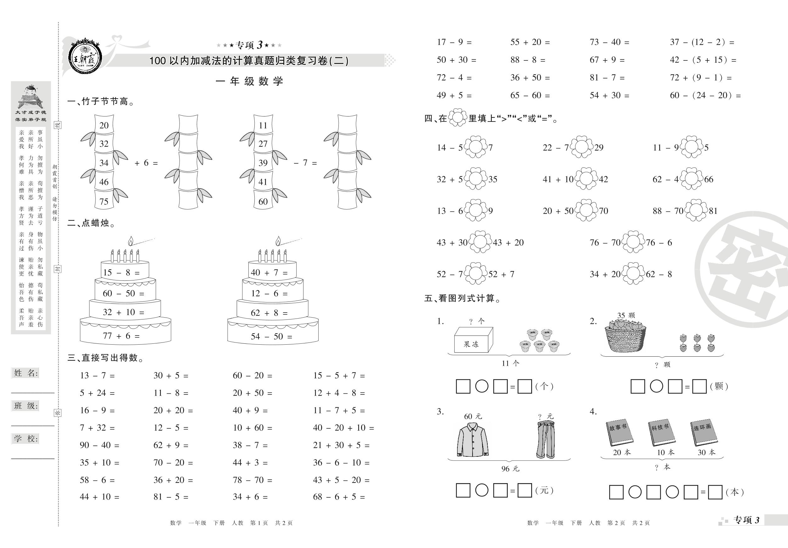 王朝霞期末专项卷——100以内加减法的计算(二)、解决问题真题归类复习卷一年级下册数学(人教版)_R210802214916【0】