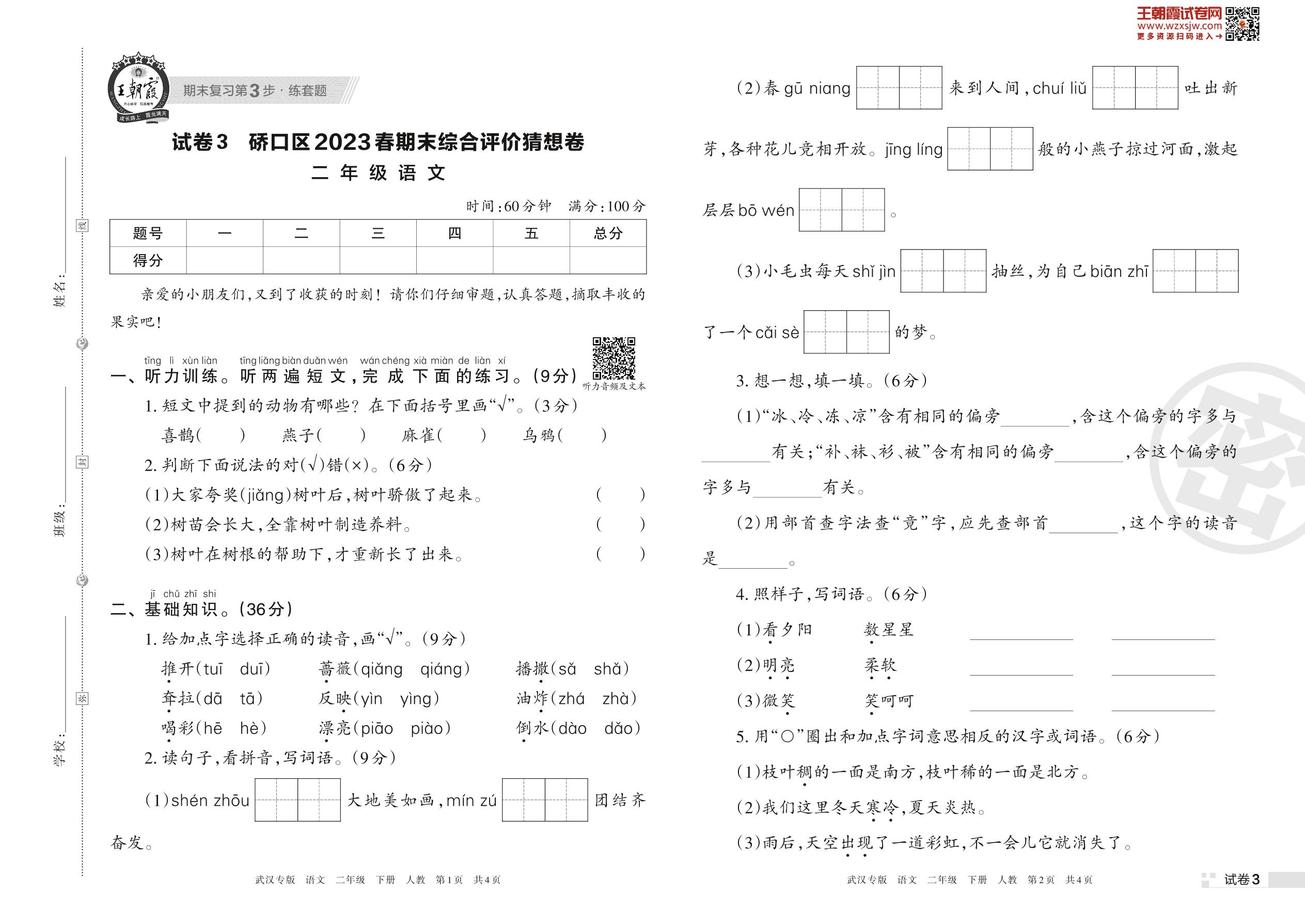 硚口区2023春期末综合评价猜想卷二年级语文(人教版)【3】