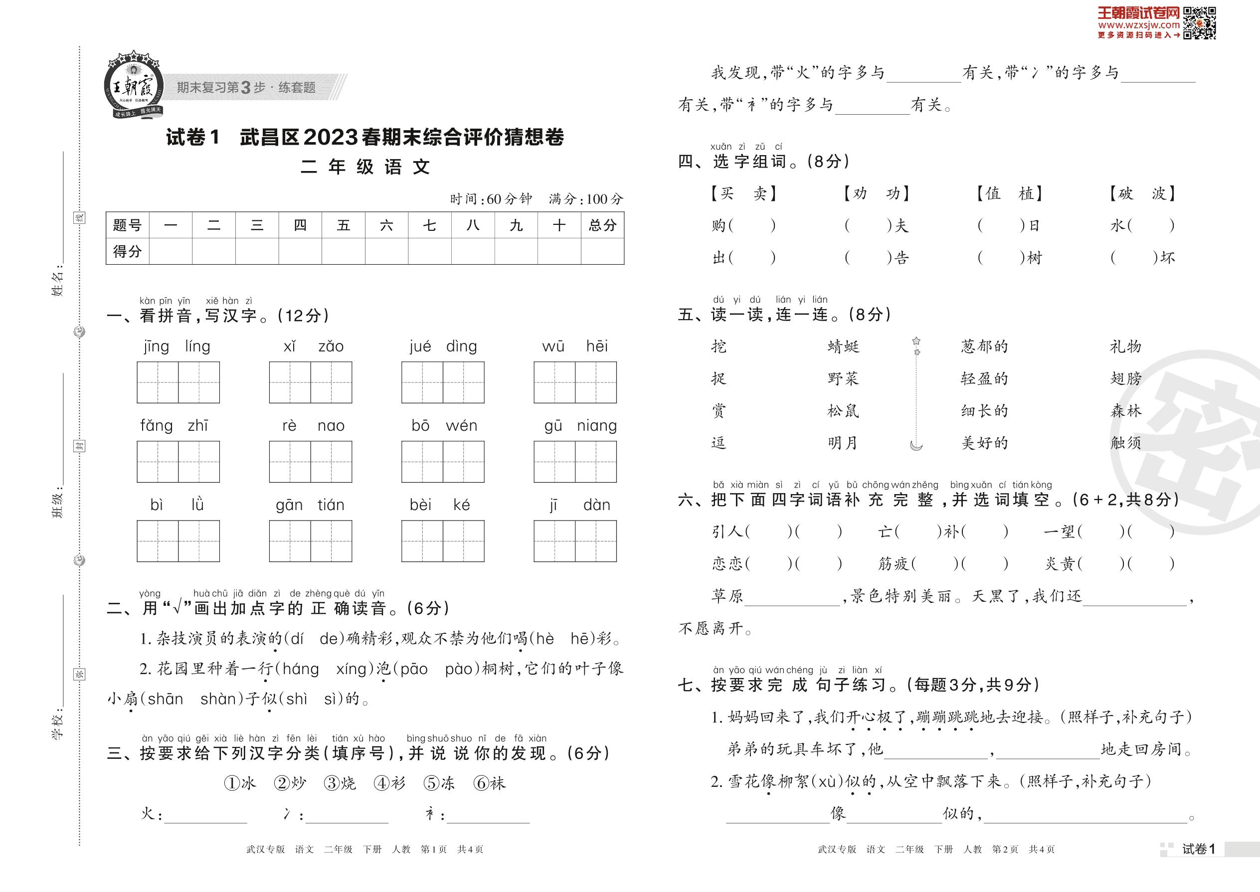 武昌区2023春期末综合评价猜想卷二年级语文(人教版)【1】