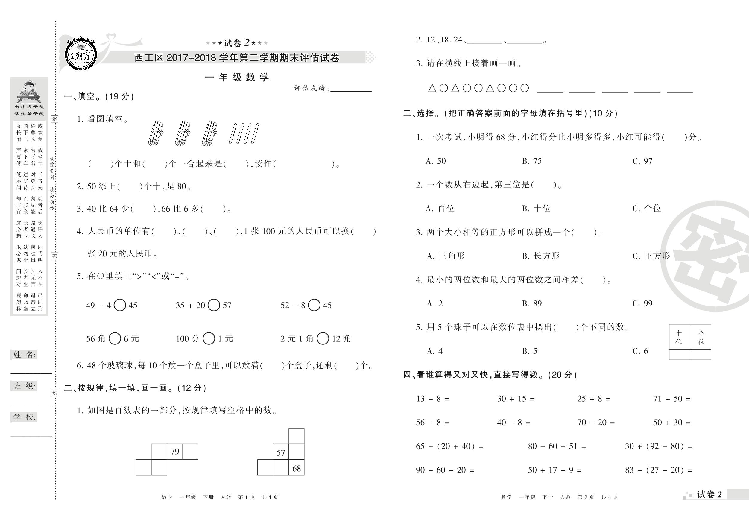 2017-2018学年第二学期洛阳市西工区一年级数学试卷(人教版)【2】