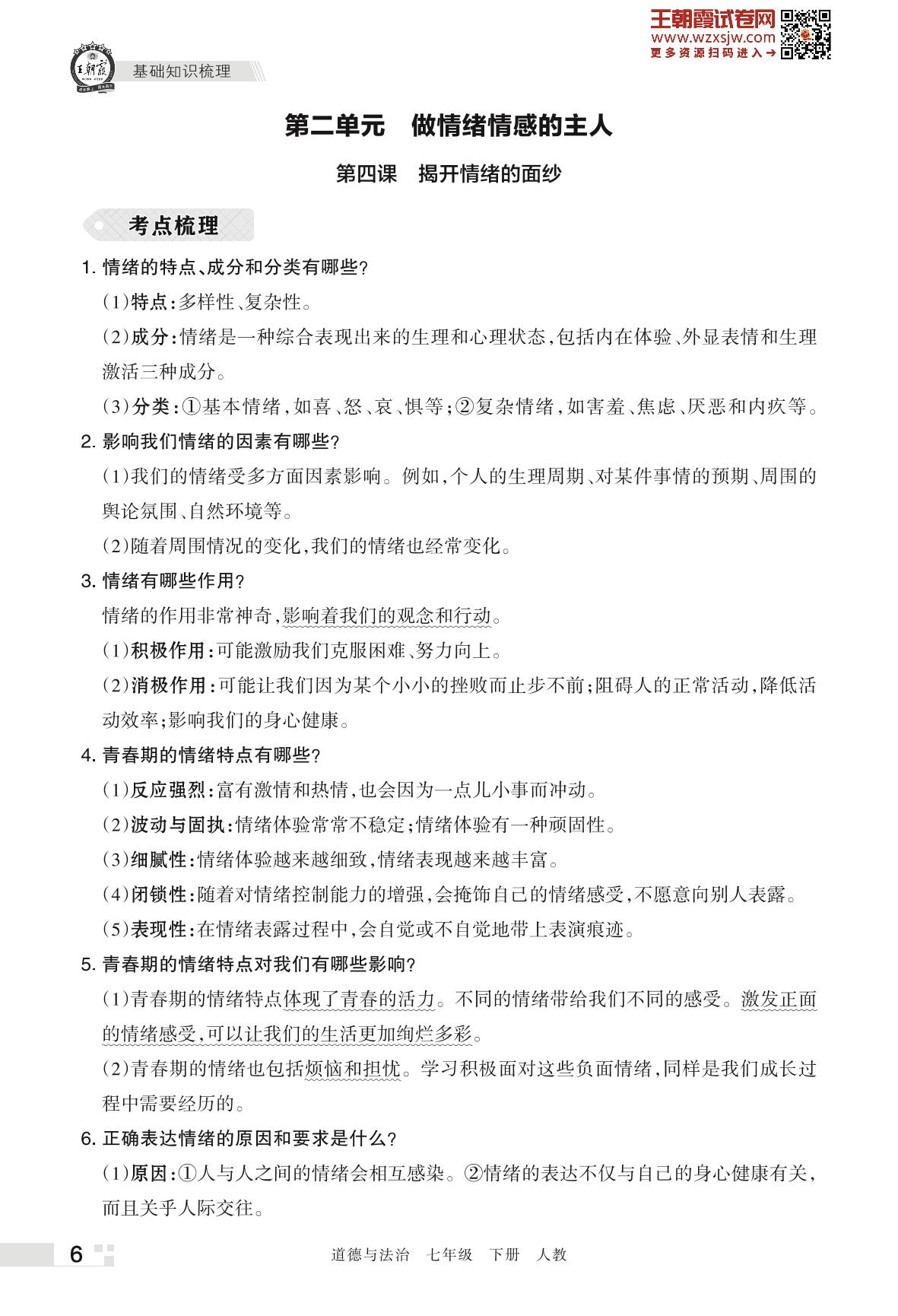 王朝霞期末知识梳理——第二单元 做情绪的主人七年级下册道德与法治(人教版)