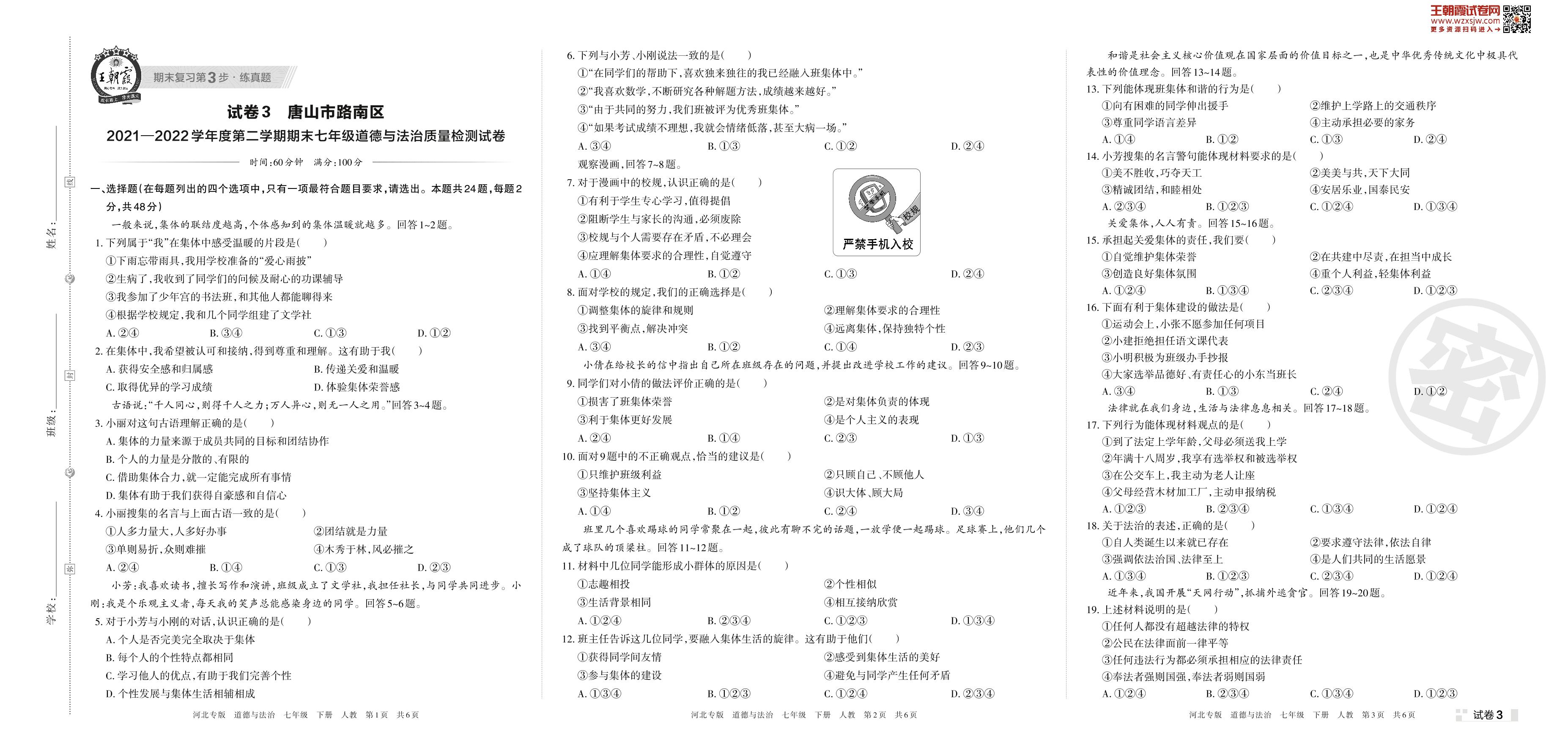 唐山市路南区2021—2022学年度第二学期期末七年级道德与法治质量检测试卷(人教版)【3】