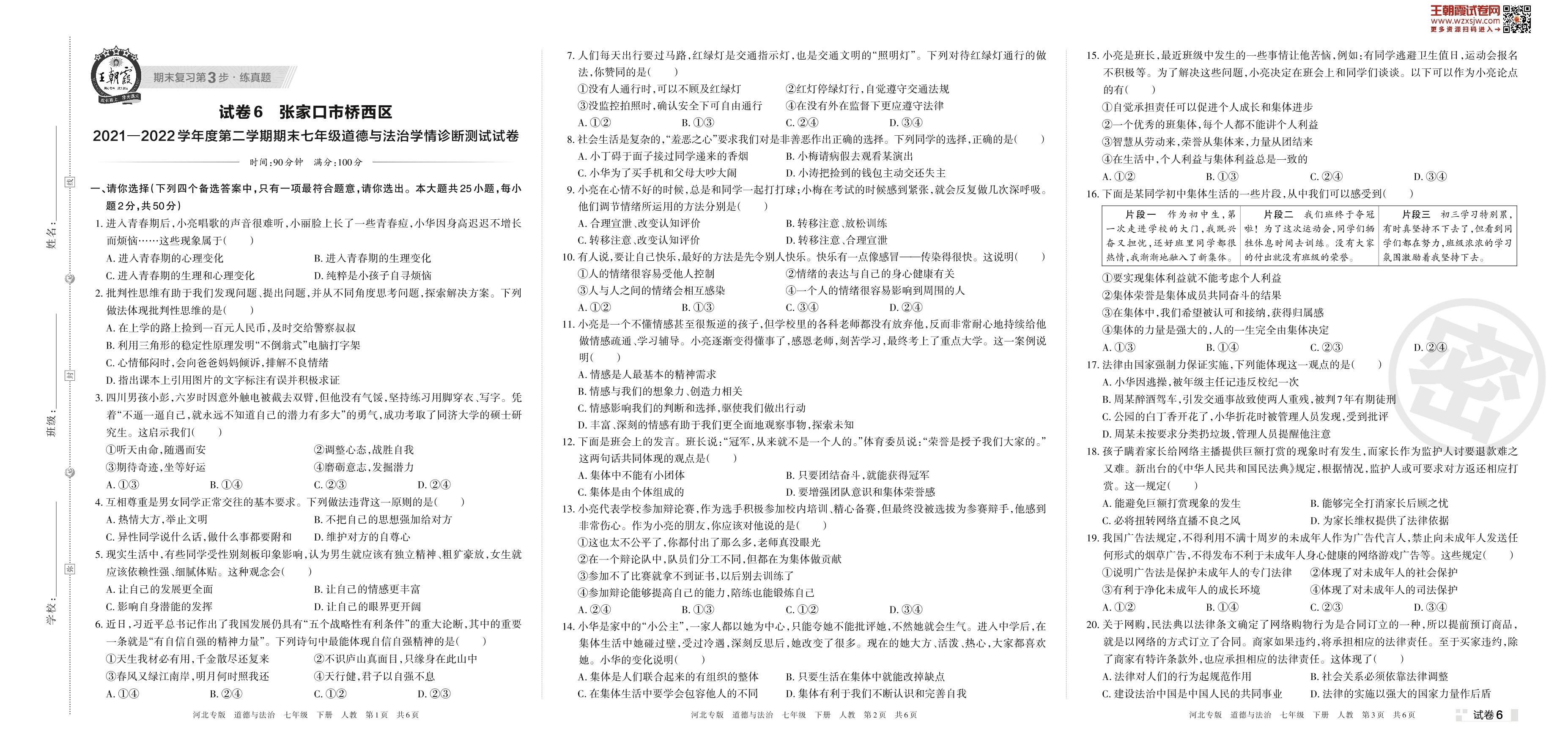 张家口市桥西区2021—2022学年度第二学期期末七年级道德与法治学情诊断测试试卷(人教版)【6】