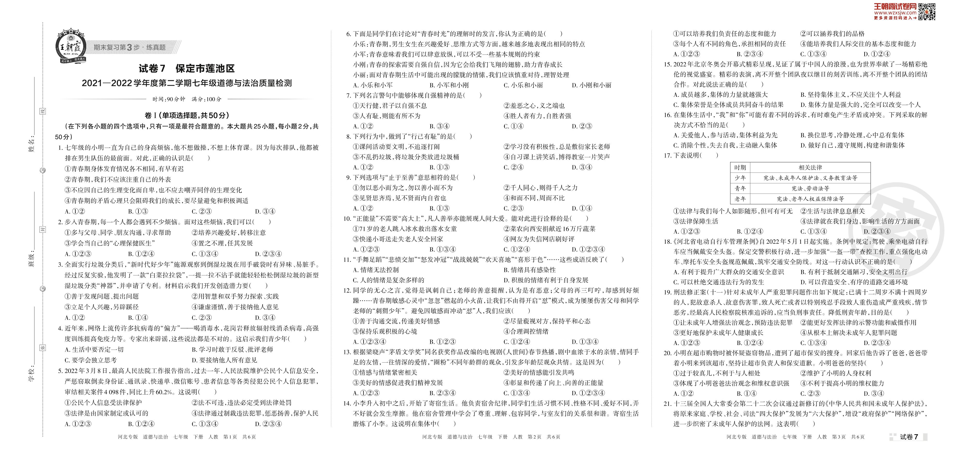 保定市莲池区2021—2022学年度第二学期七年级道德与法治质量检测(人教版)【7】