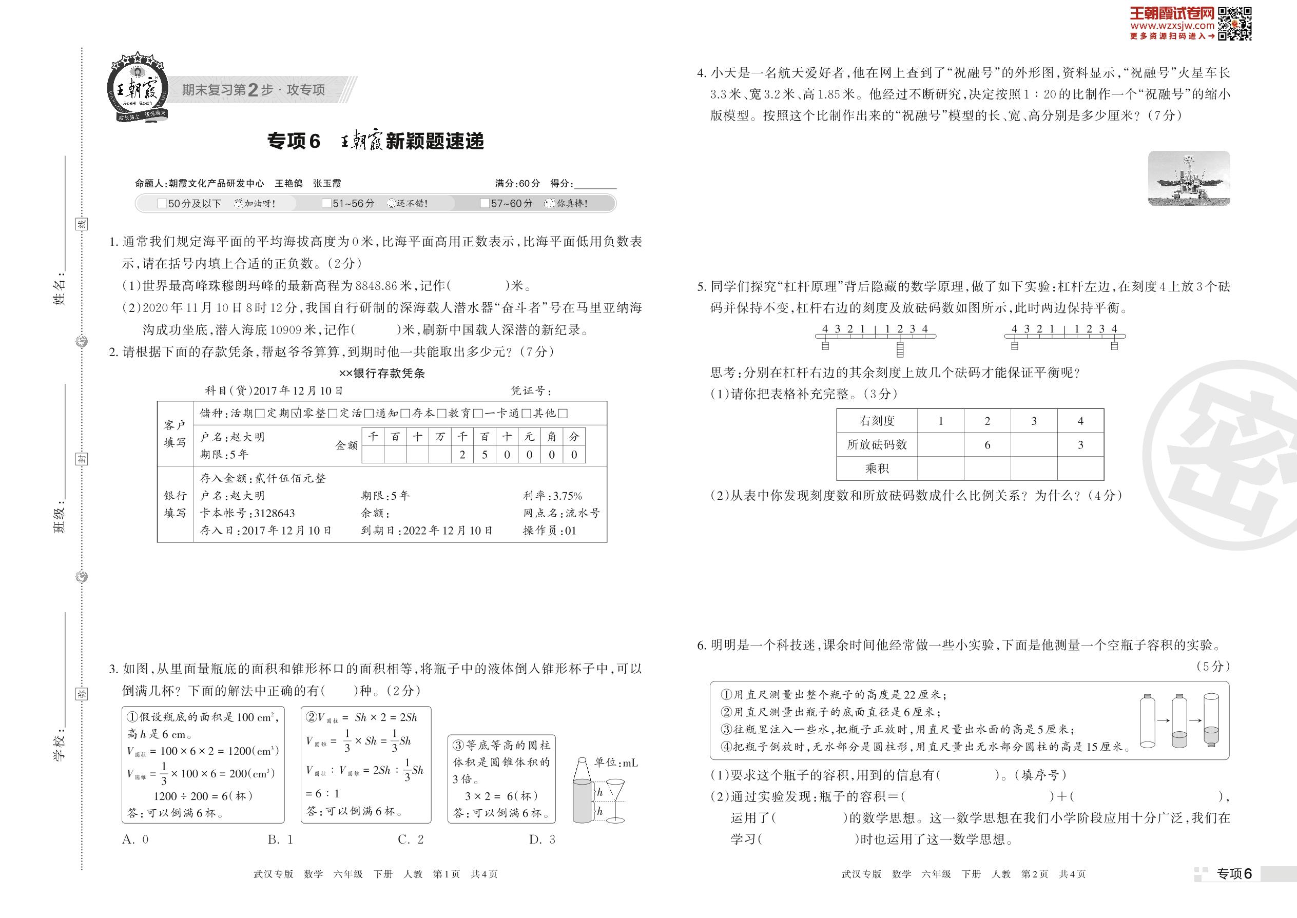 王朝霞期末专项卷——王朝霞新颖题速递:生活与数学六年级下册数学(人教版)_R230420164515724【6】
