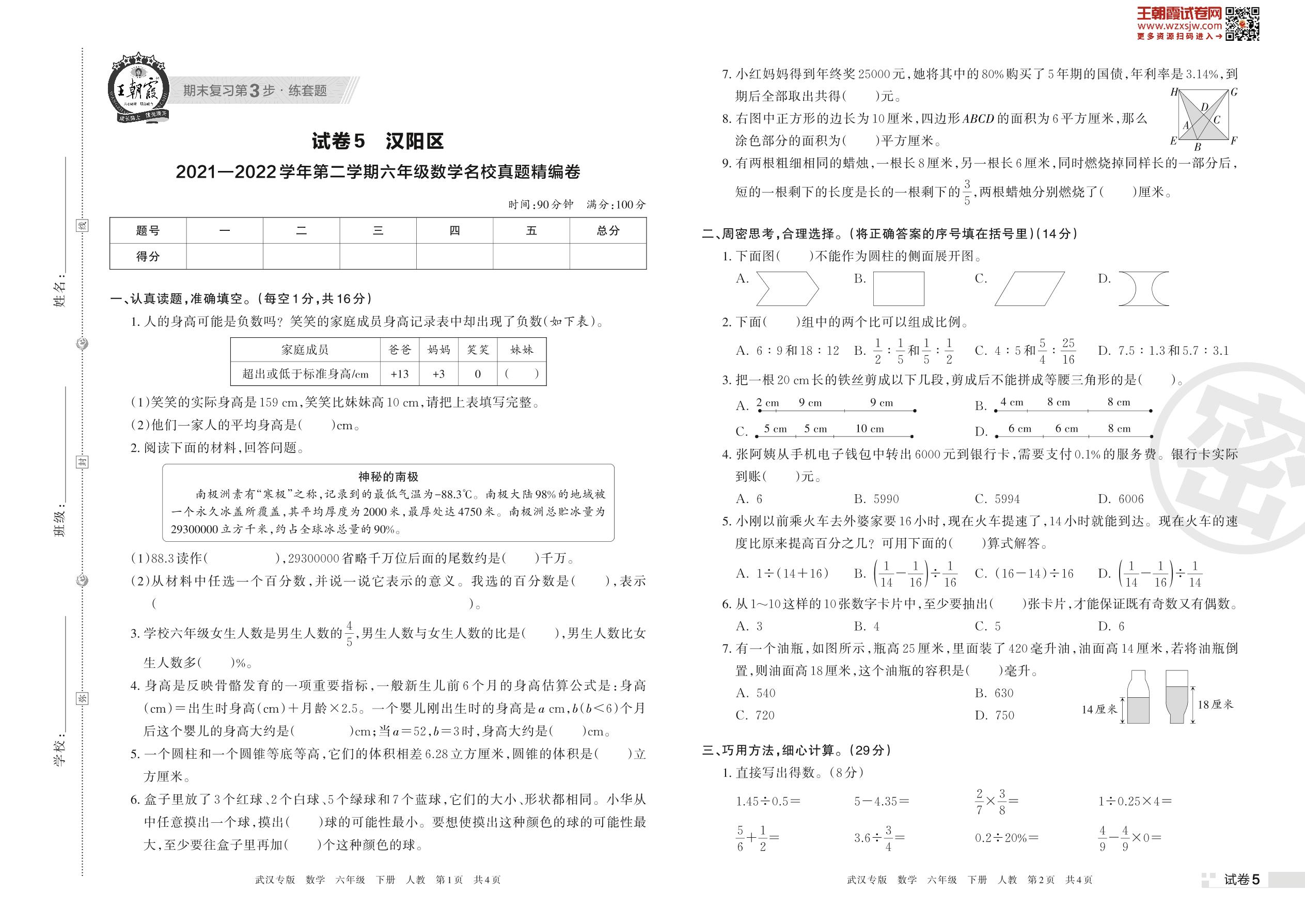汉阳区2021—2022学年第二学期六年级数学名校真题精编卷(人教版)【5】