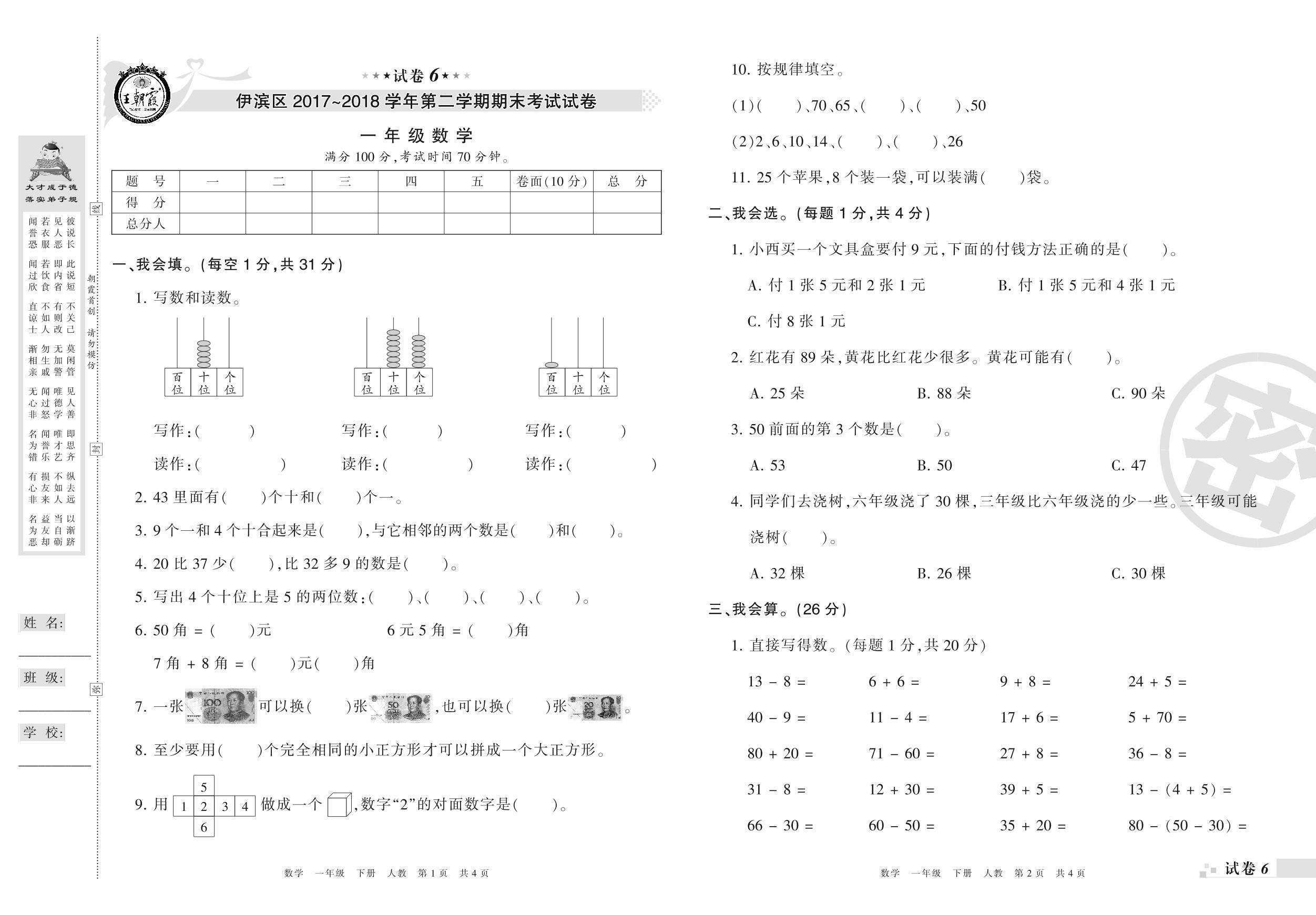 2017-2018学年第二学期洛阳市伊滨区一年级数学试卷(人教版)【6】