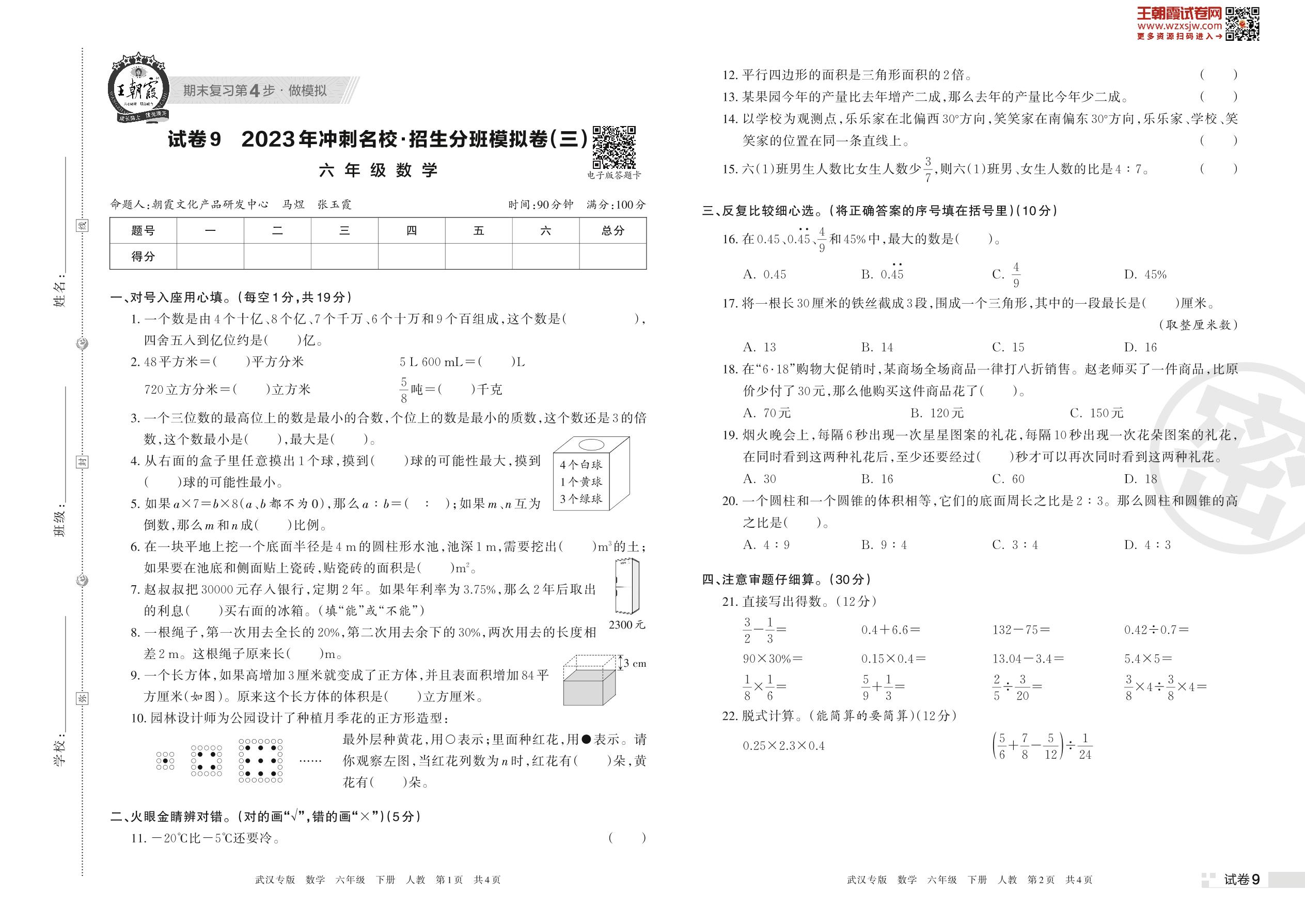 2023年冲刺名校·招生分班模拟卷(三)六年级下册数学(人教版)【9】