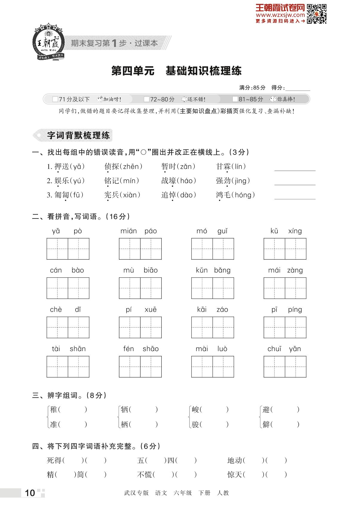王朝霞期末过课本——第四单元 基础知识梳理练六年级下册语文(人教版)_R230420165736573