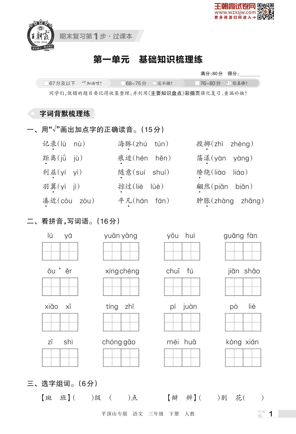 王朝霞期末过课本——第一单元 基础知识梳理练三年级下册语文(人教版)_R230420170308962