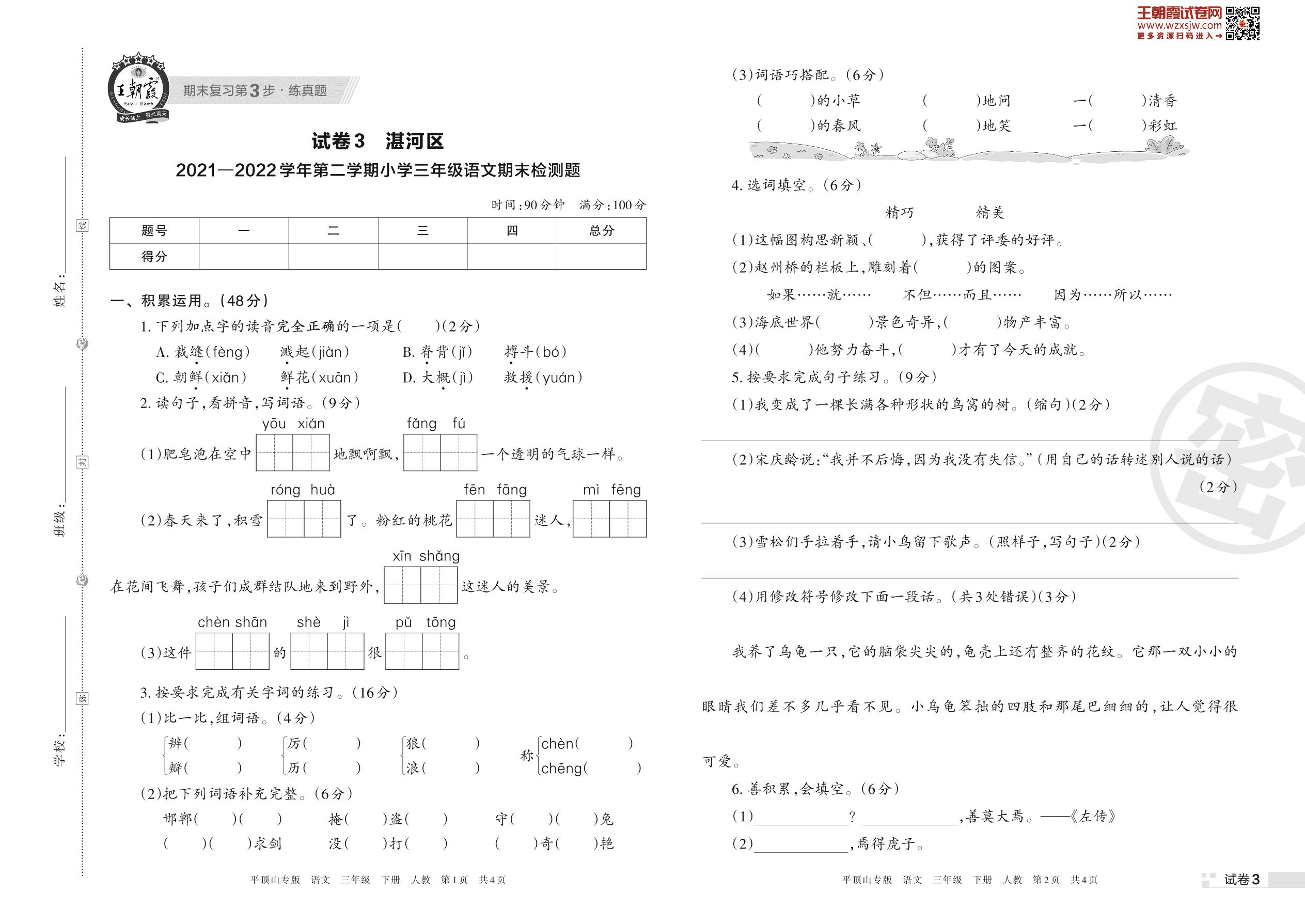 湛河区2021—2022学年第二学期小学三年级语文期末检测题(人教版)【3】