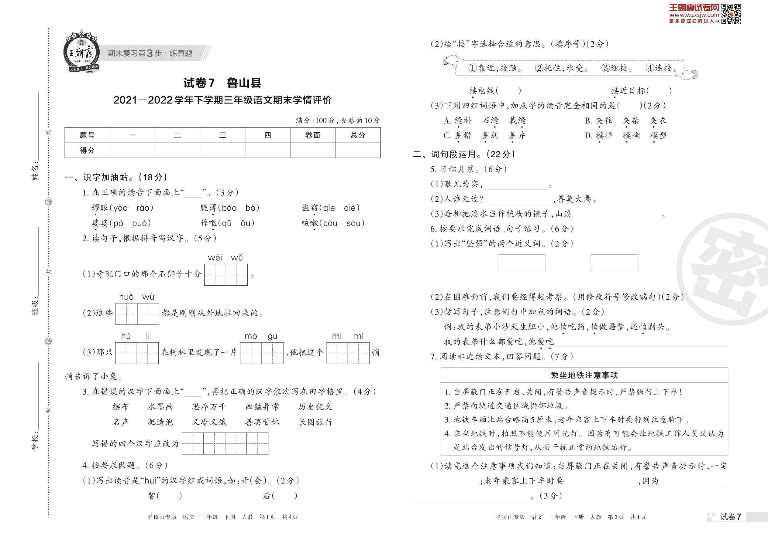 三年级语文人教版下册期末卷