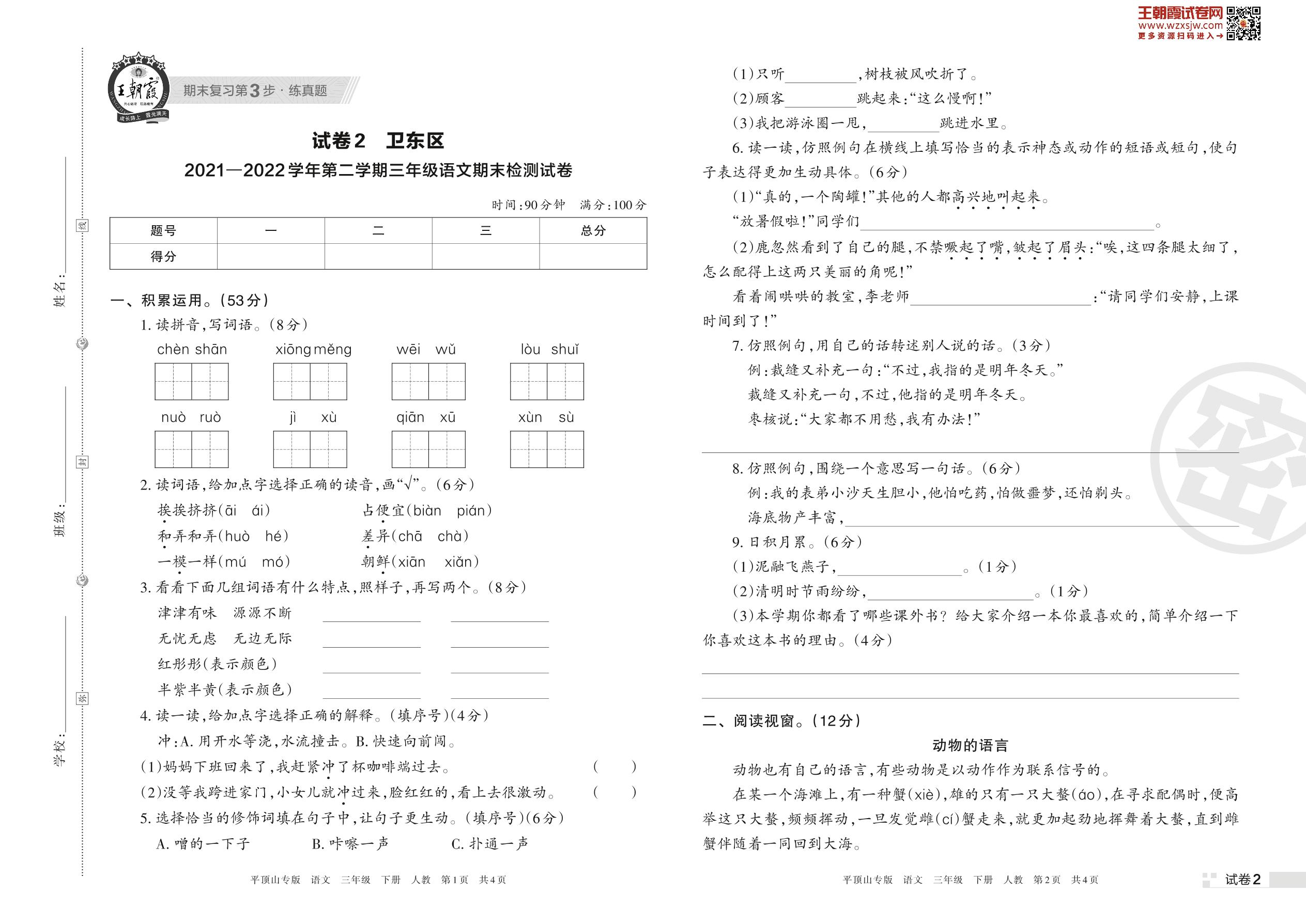 卫东区2021—2022学年第二学期三年级语文期末检测试卷(人教版)【2】