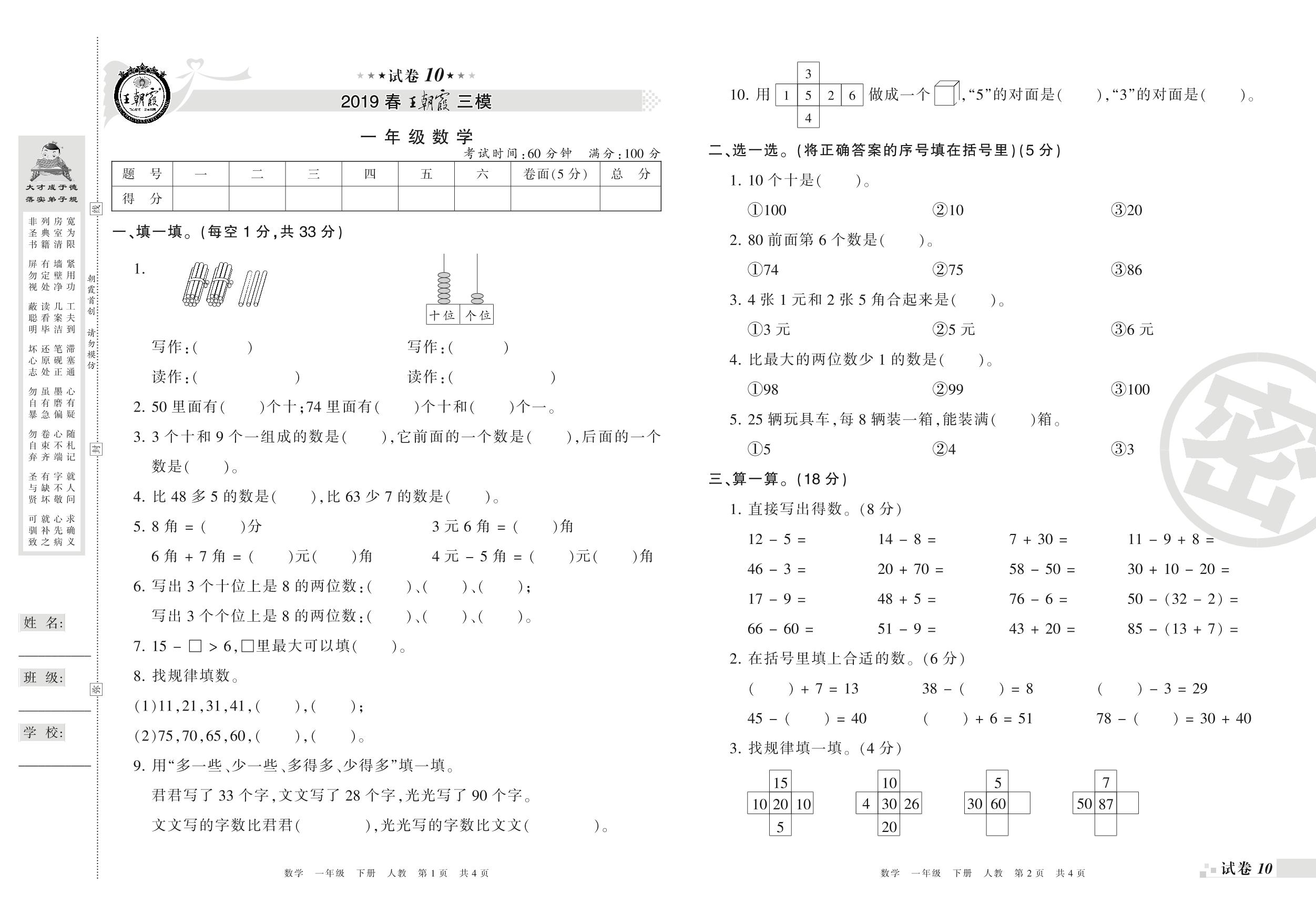 王朝霞期末模拟卷一年级下册数学(人教版)_R210802214952【10】