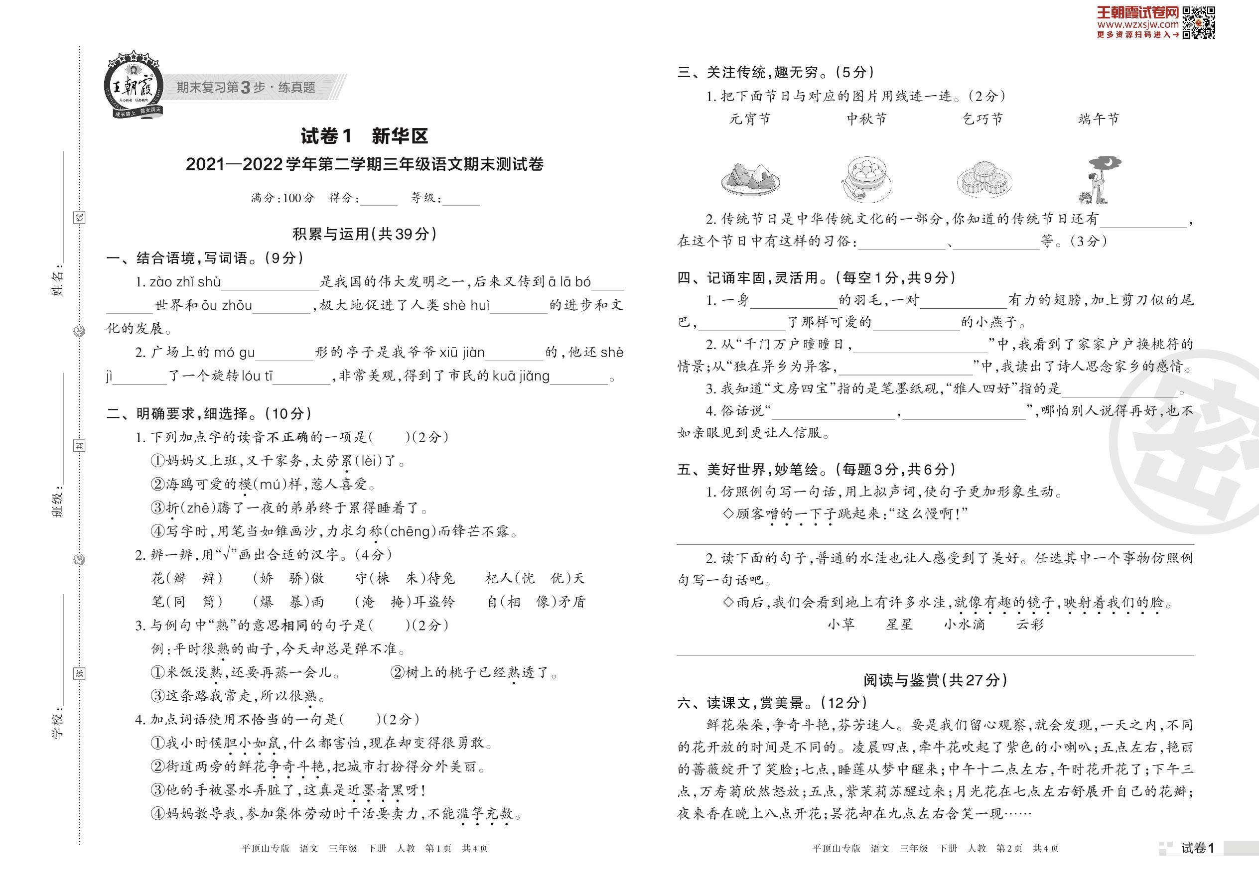 新华区2021—2022学年第二学期三年级语文期末测试卷(人教版)【1】
