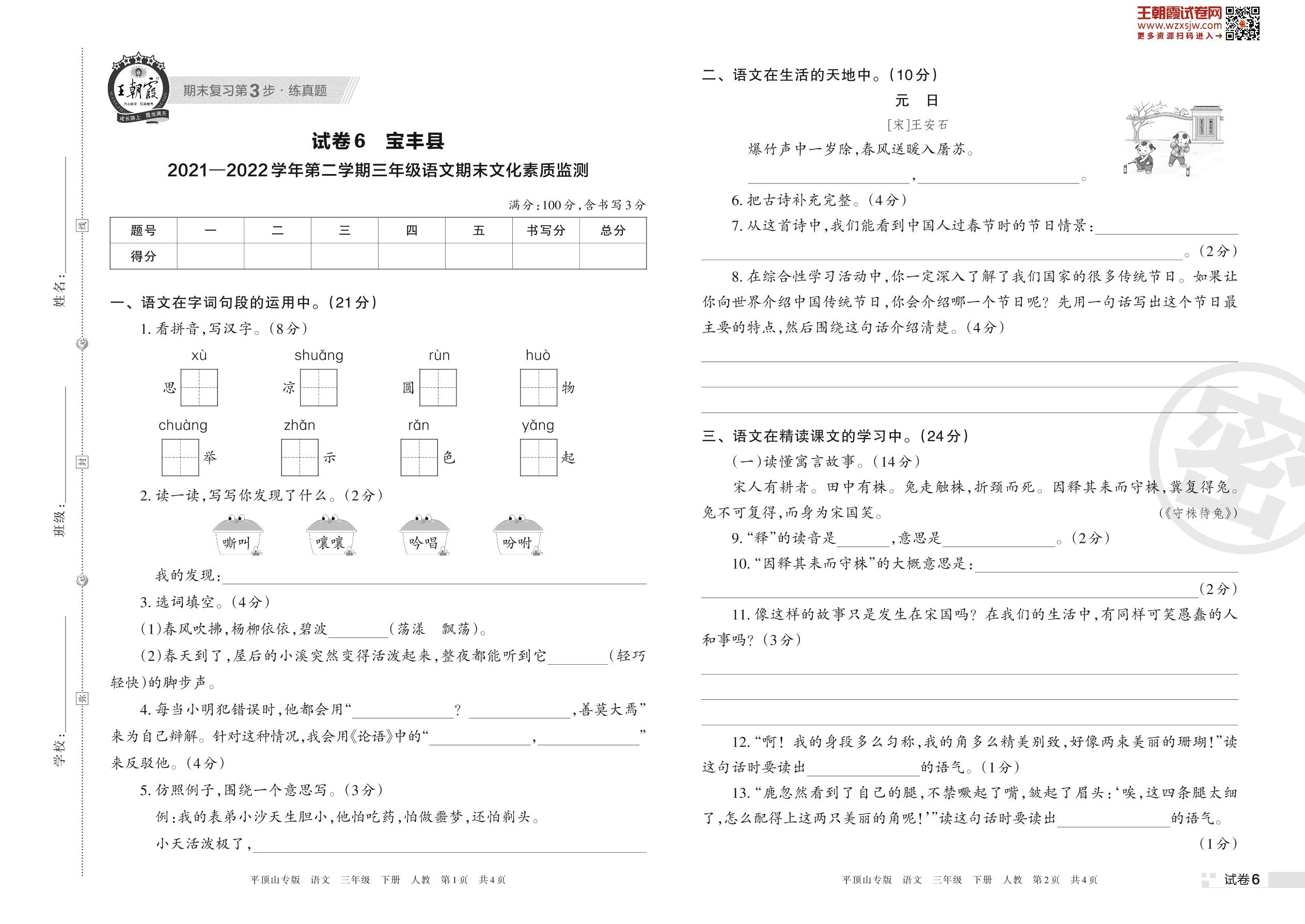 宝丰县2021—2022学年第二学期三年级语文期末文化素质监测(人教版)【6】