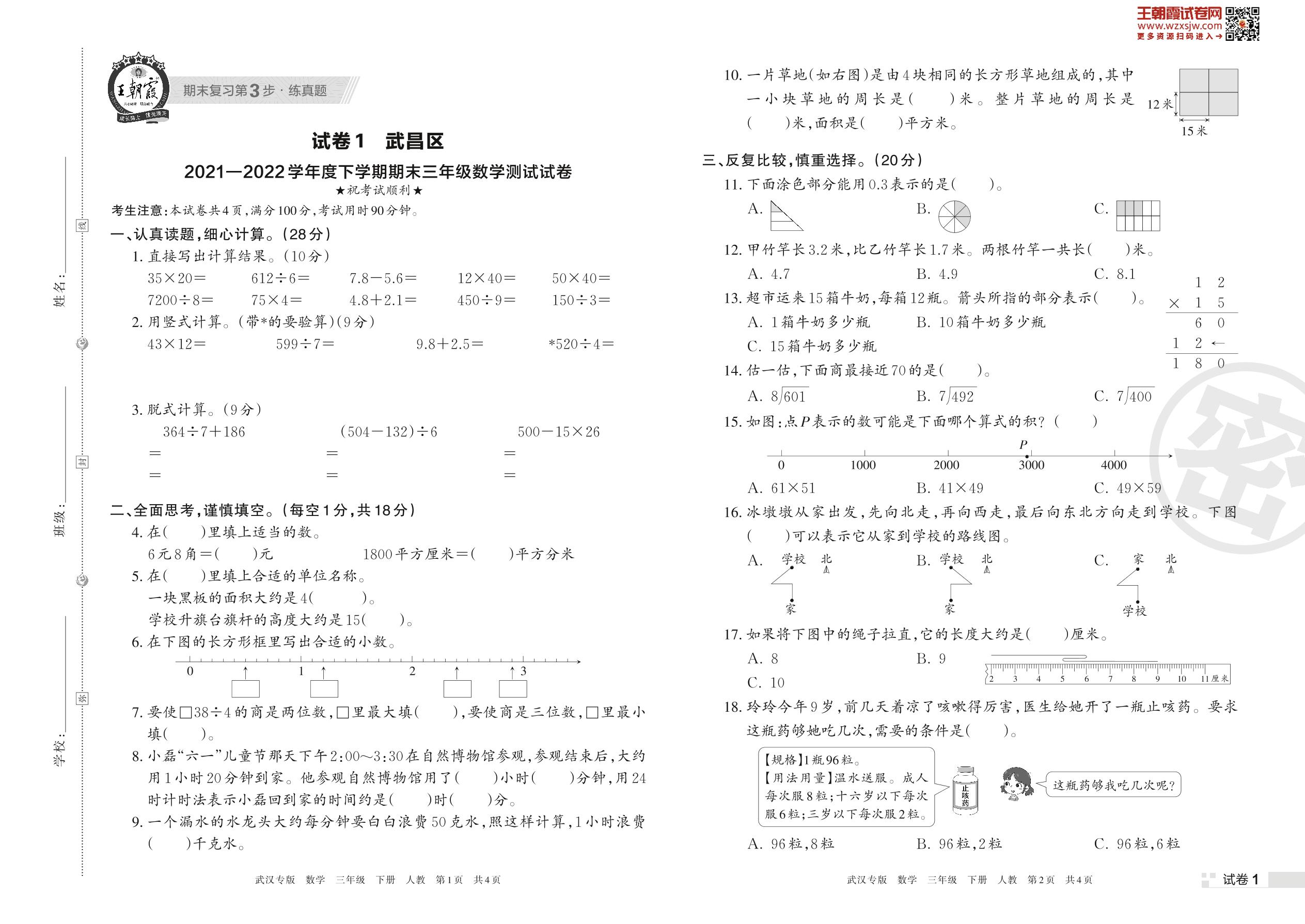 武昌区2021—2022学年度下学期期末三年级数学测试试卷(人教版)【1】